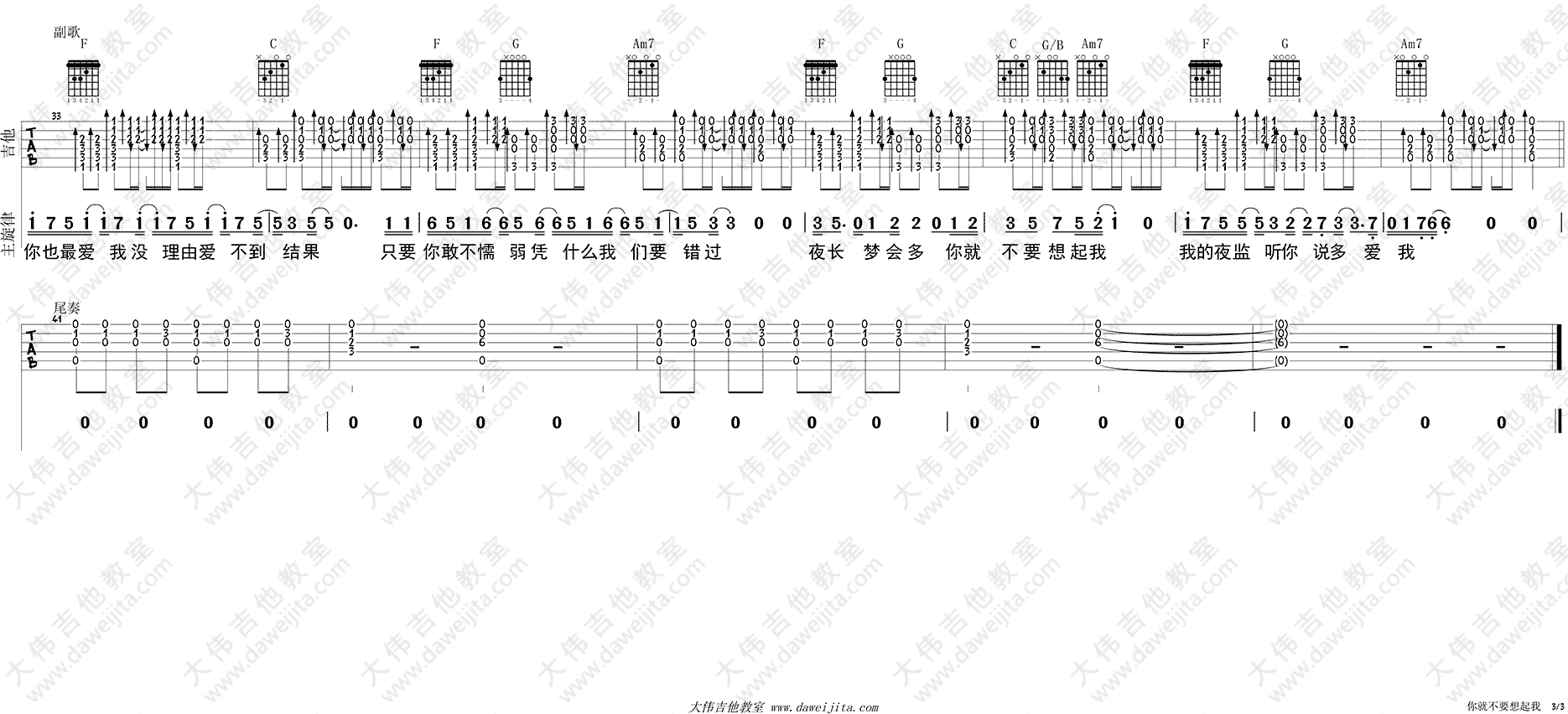 曲谱介绍: 你就不要想起我吉他谱,总共3张高清图片谱,选用C调指法,实际音高升C调,节拍4/4拍,速度每分钟56BPM,弹唱建议变调夹夹1品弹唱,弹唱难度初级,下方附有大伟老师《你就不要想起我》吉他弹唱演示视频。 《你就不要想起我》吉他弹唱演示视频