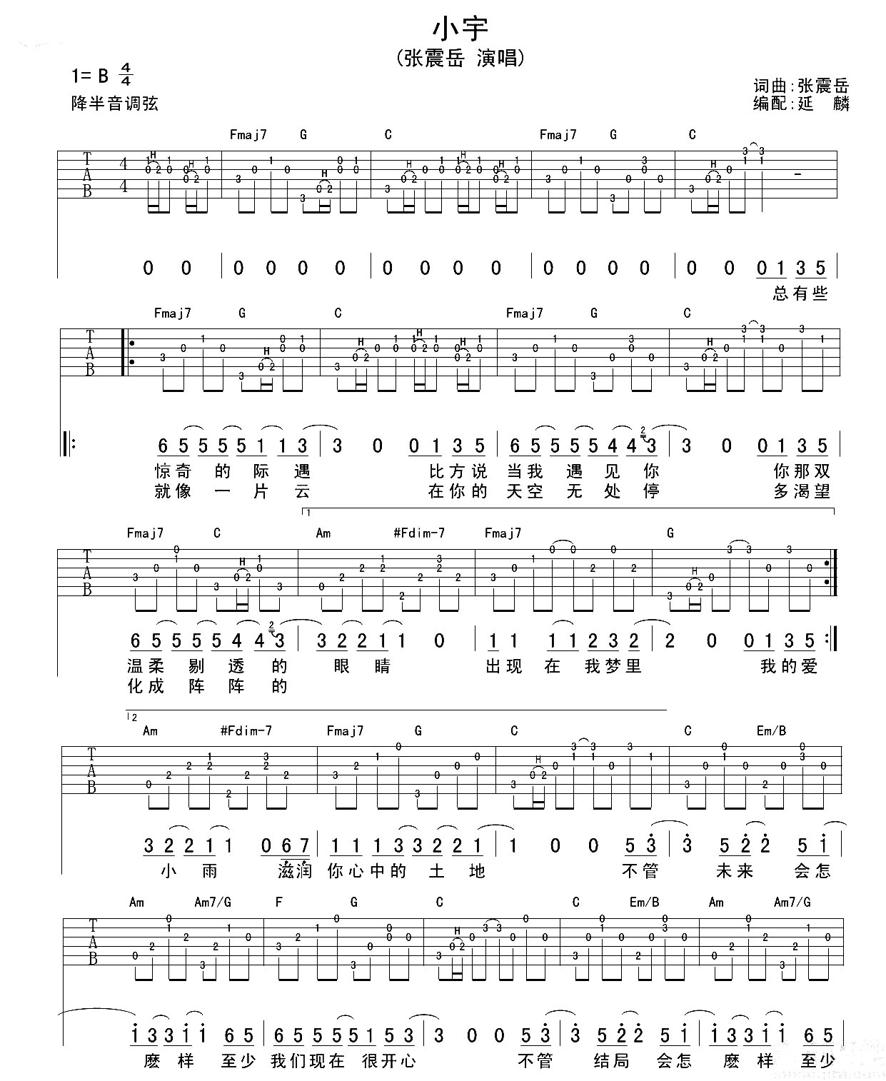曲谱介绍: 小宇吉他谱,总共3张高清图片谱,选用B调指法,节拍4/4拍,降半音调弦,弹唱难度初级。