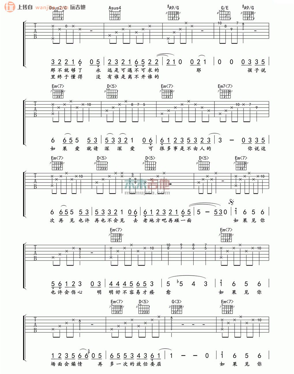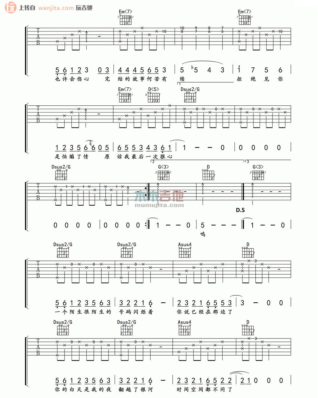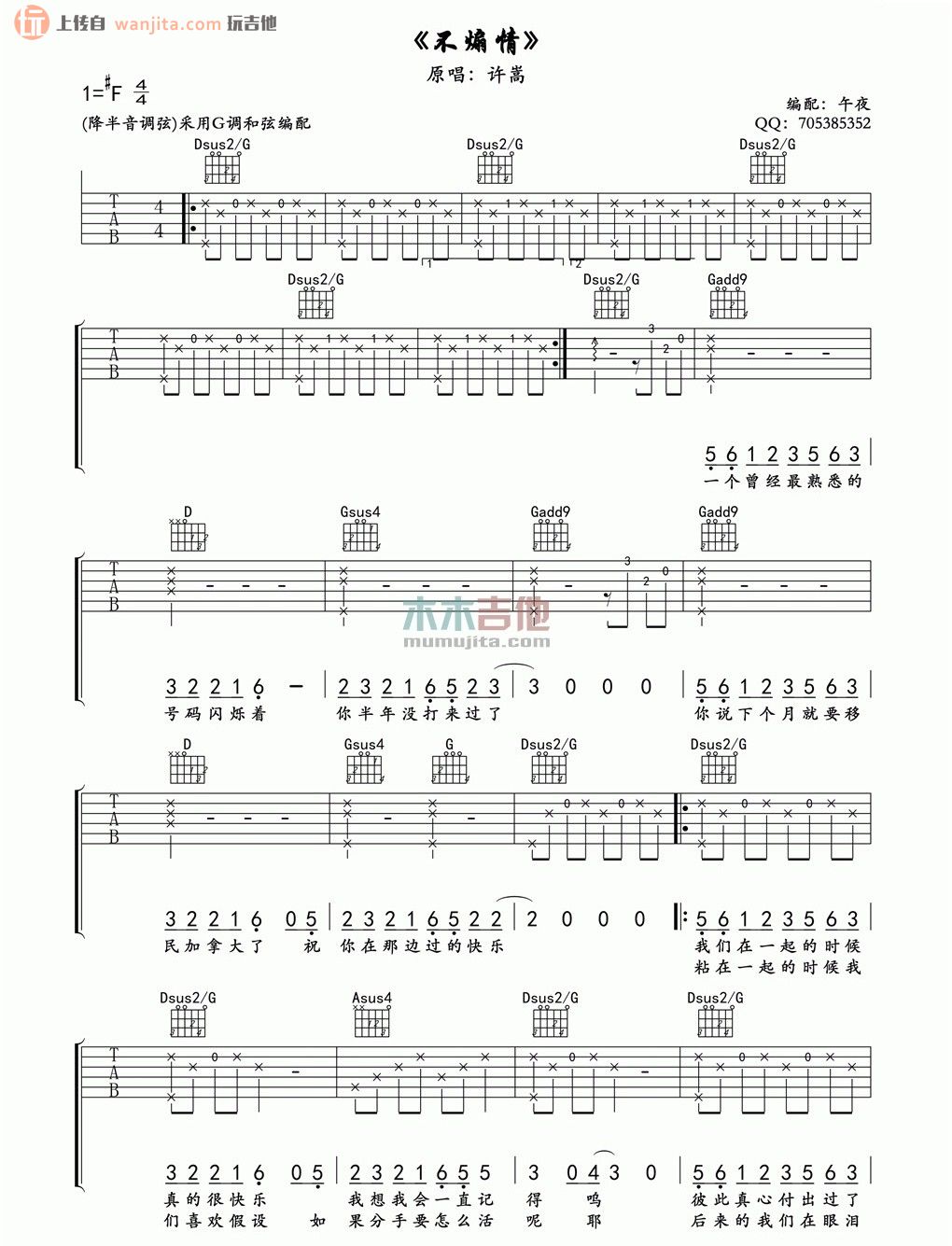 曲谱介绍: 《不煽情》吉他谱,总共4张高清图片谱,原调是升F调,降半音调弦,选用G调和弦编配,节拍4/4拍,不使用变调夹,弹唱难度中级。