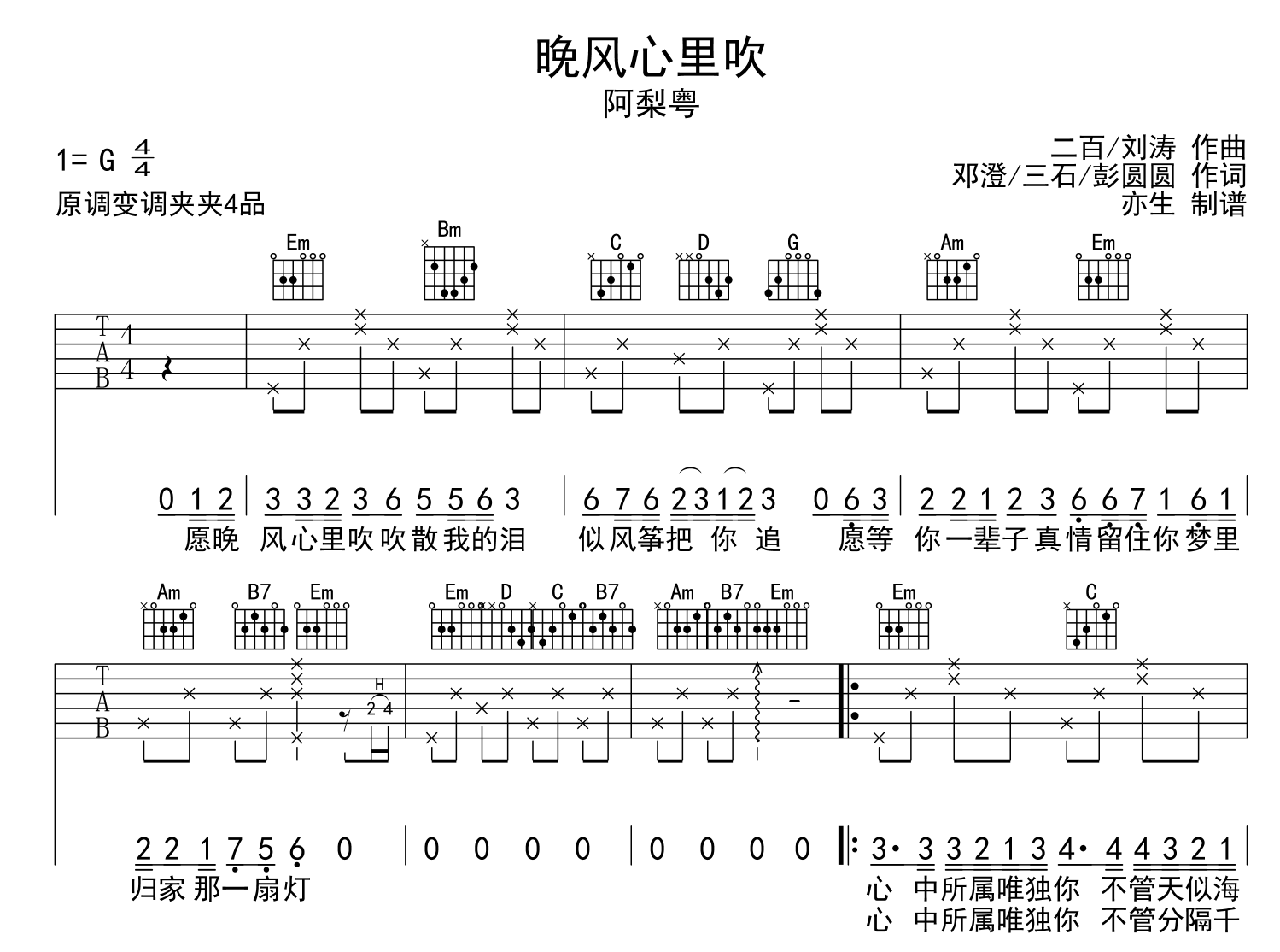 曲谱介绍: 阿梨粤《晚风心里吹》吉他弹唱谱,采用G调指法编配,共有2张高清图谱,免翻页排版设计。