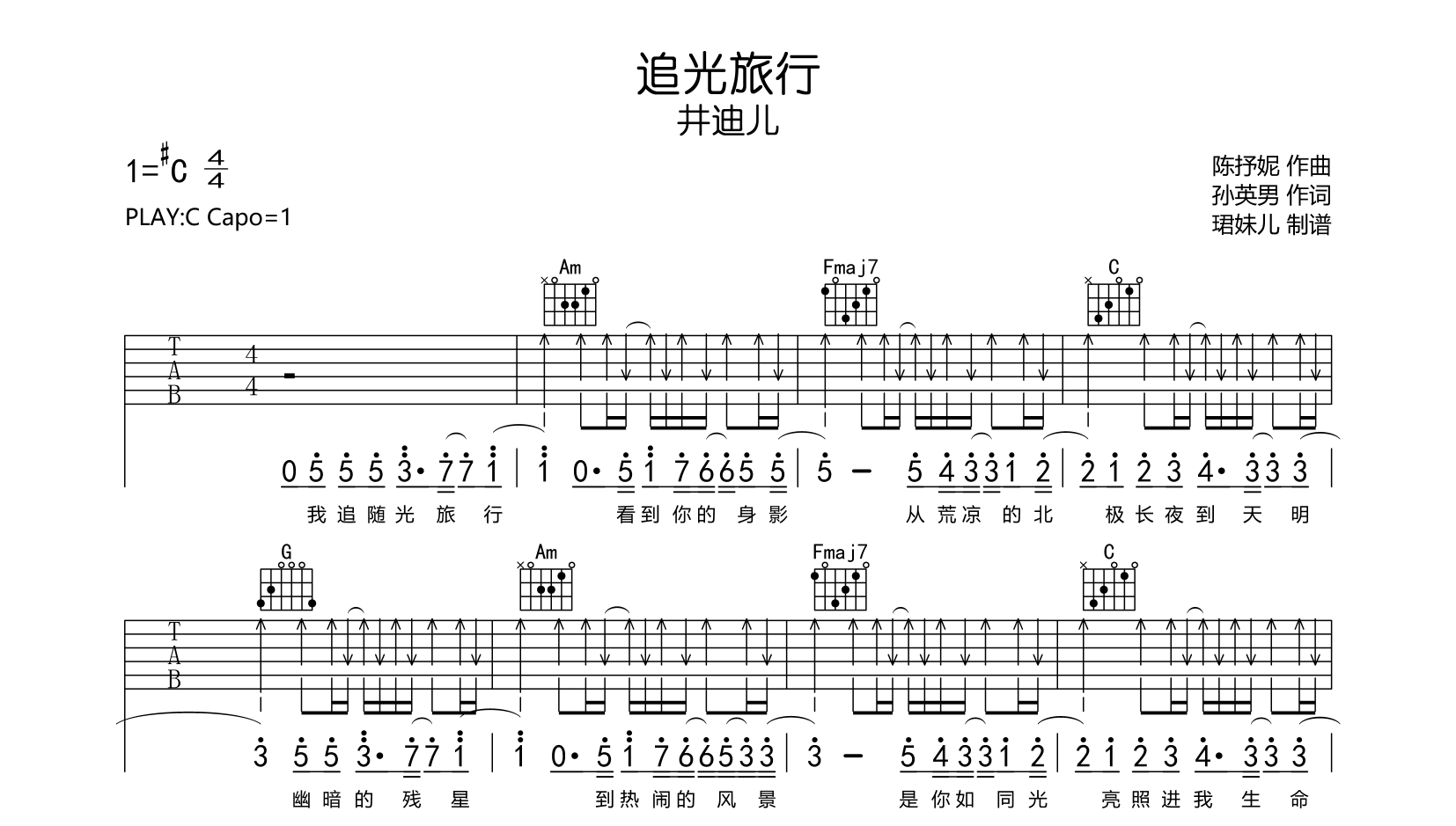 曲谱介绍: 井迪儿《追光旅行》吉他弹唱谱,采用C调指法编配,共有2张高清图谱,免翻页排版设计。