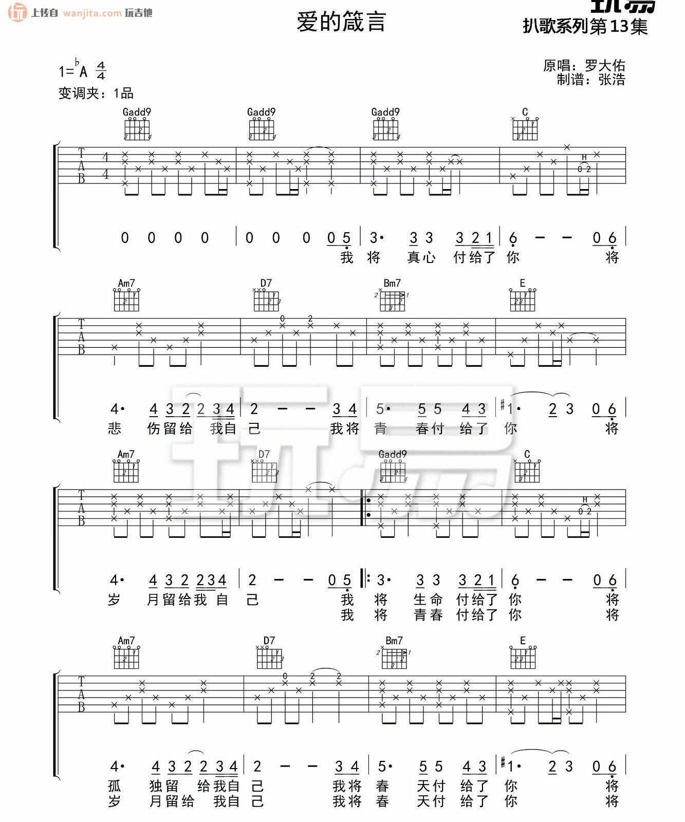 曲谱介绍: 罗大佑《爱的箴言》吉他弹唱谱,采用A调指法编配,共有3张高清图谱。
