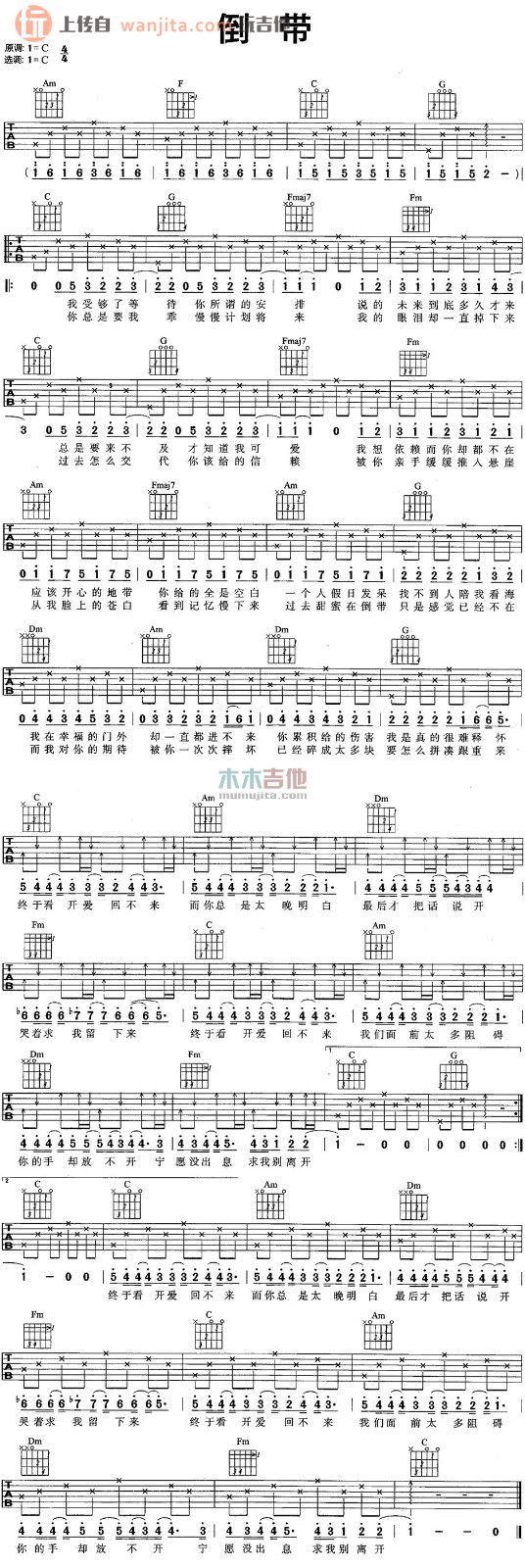 曲谱介绍: 倒带吉他谱,总共1张高清图片谱,原调是C调,选用C调指法,节拍4/4拍,不使用变调夹,弹唱难度初级。