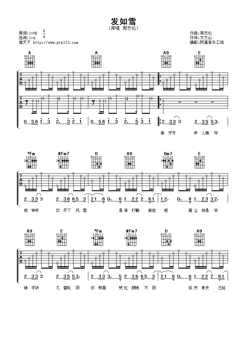 发如雪吉他谱 - 周杰伦 - A调吉他弹唱谱