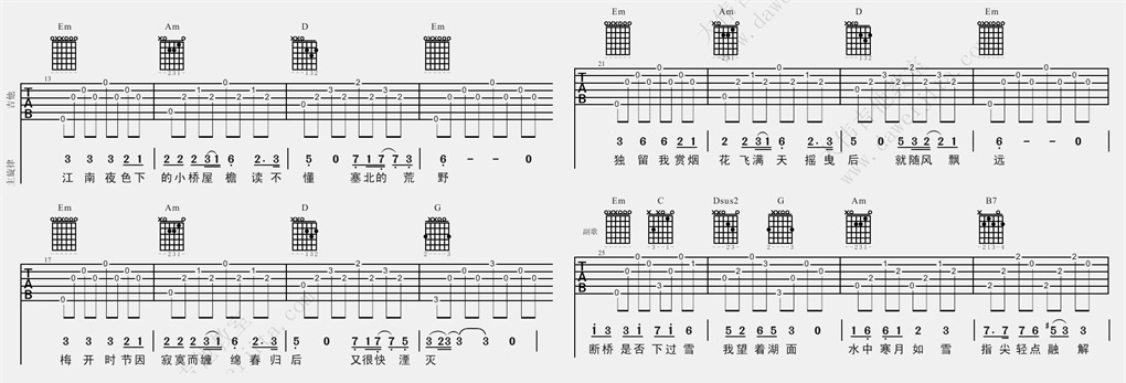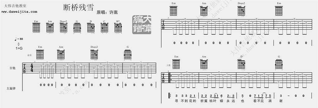 曲谱介绍: 许嵩《断桥残雪》吉他弹唱谱,采用G调指法编配,共有4张高清图谱。
