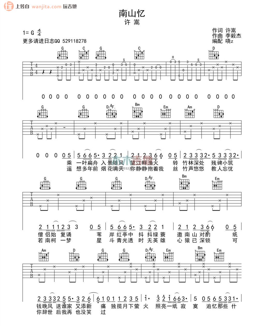 曲谱介绍: 许嵩《南山忆》吉他弹唱谱,采用G调指法编配原版,共有2张高清图谱,免翻页排版设计。