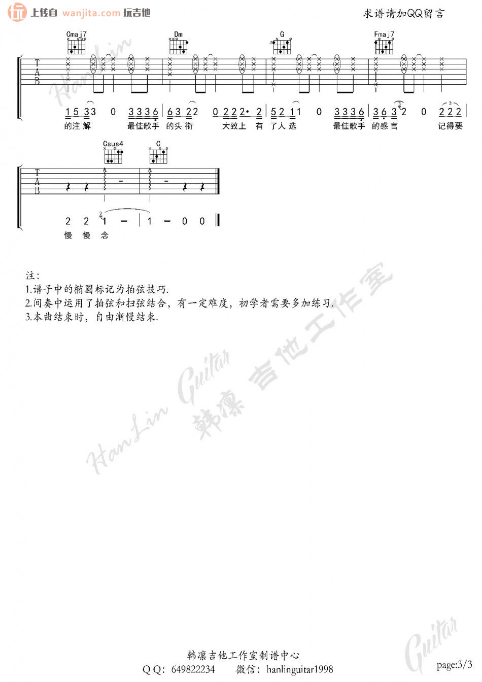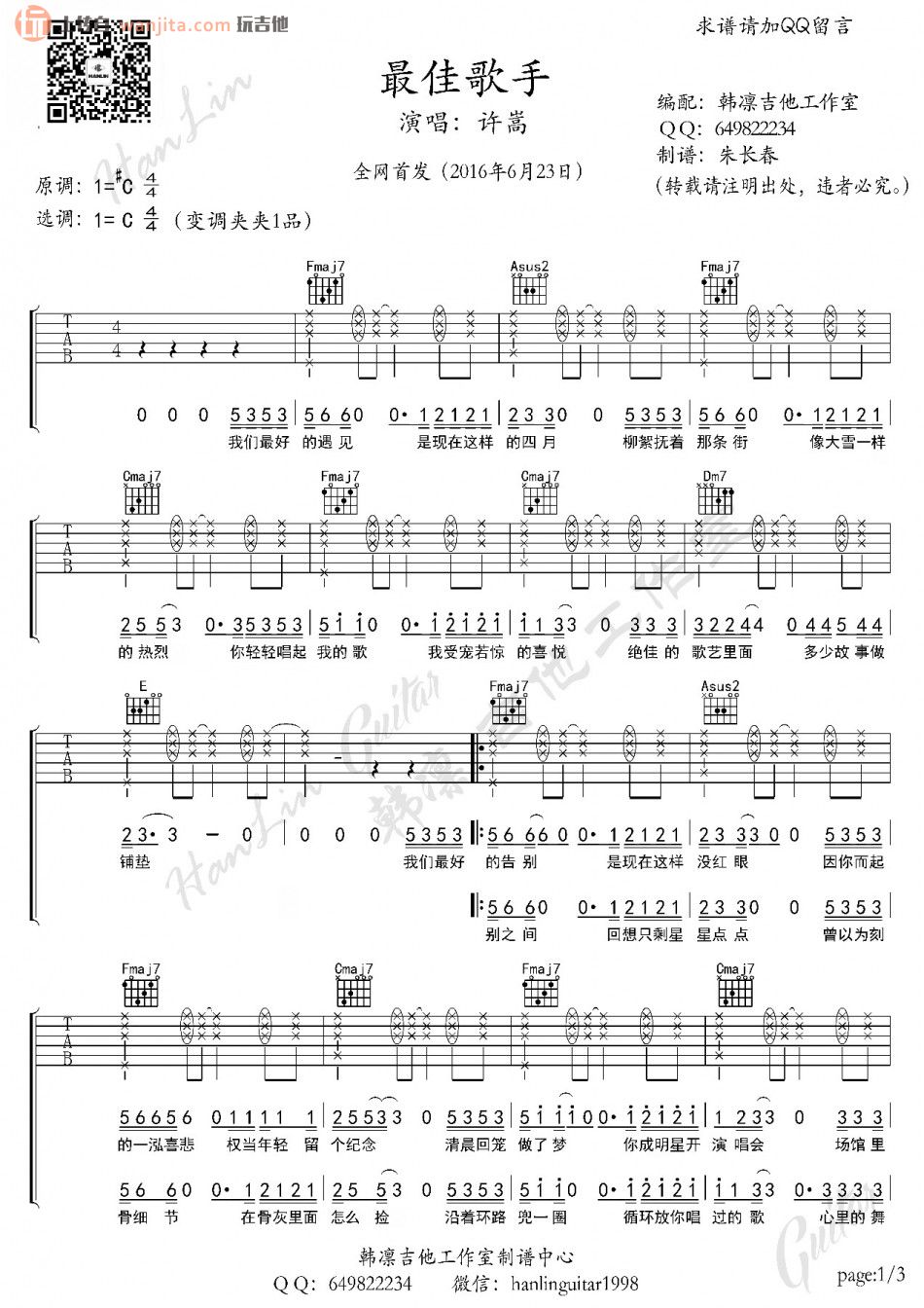 曲谱介绍: 最佳歌手吉他谱,总共3张高清图片谱,原调是升C调,选用C调指法,节拍4/4拍,弹唱建议变调夹夹1品弹唱原曲调,弹唱难度初级。