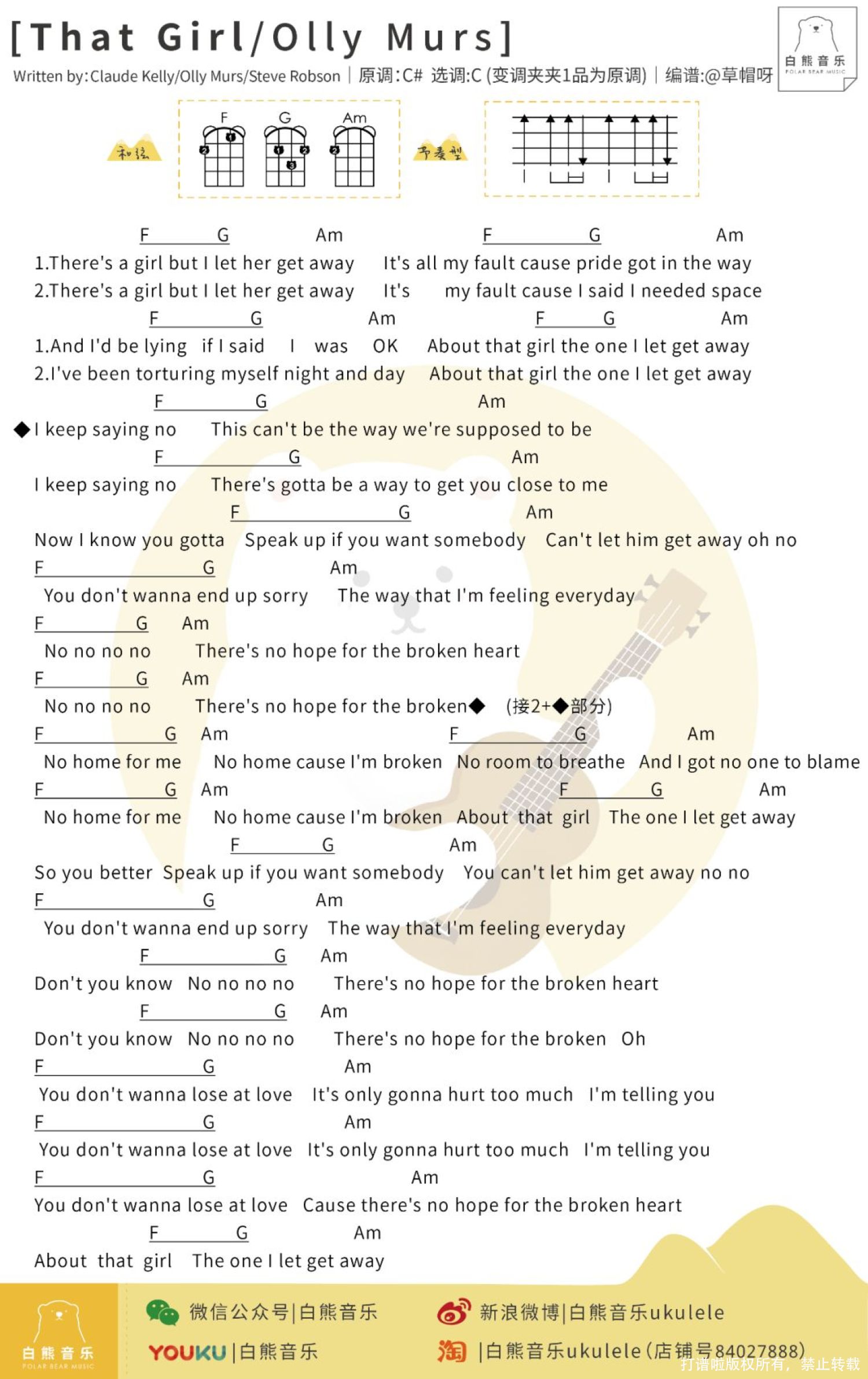 曲谱介绍: 《That Girl》尤克里里弹唱谱   不得不说抖音真是一个神奇的地方,前段时间,一个中学生在讲台上演唱了奥利·莫尔斯的〈That Girl〉被同学录了视频上传到抖音,瞬间霸屏,网友纷纷感叹比原唱还好听。根据网友爆料,唱歌的男生英语成绩是班里最差的,不过他的老师已经澄清了,成绩基本科科前五。不过由于考虑到火爆程度会影响他的现实生活,于是已屏蔽了这条视频~没有听到的可以来听一下原曲奥利·莫尔斯演唱的~