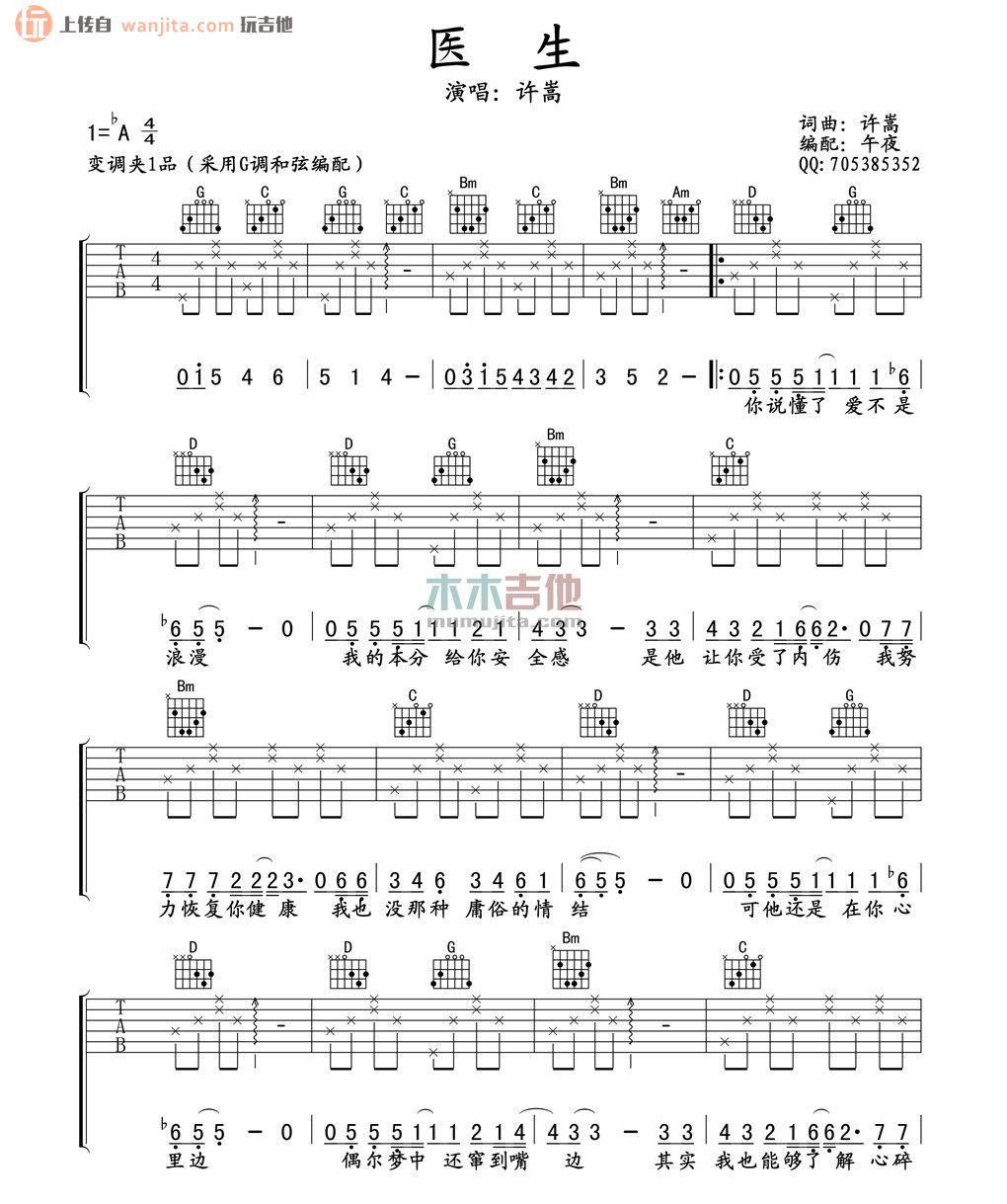 曲谱介绍: 许嵩医生吉他谱,总共2张高清图片谱,原调是降A调,选用G调和弦编配,节拍4/4拍,弹唱建议变调夹夹1品,弹唱难度初级。