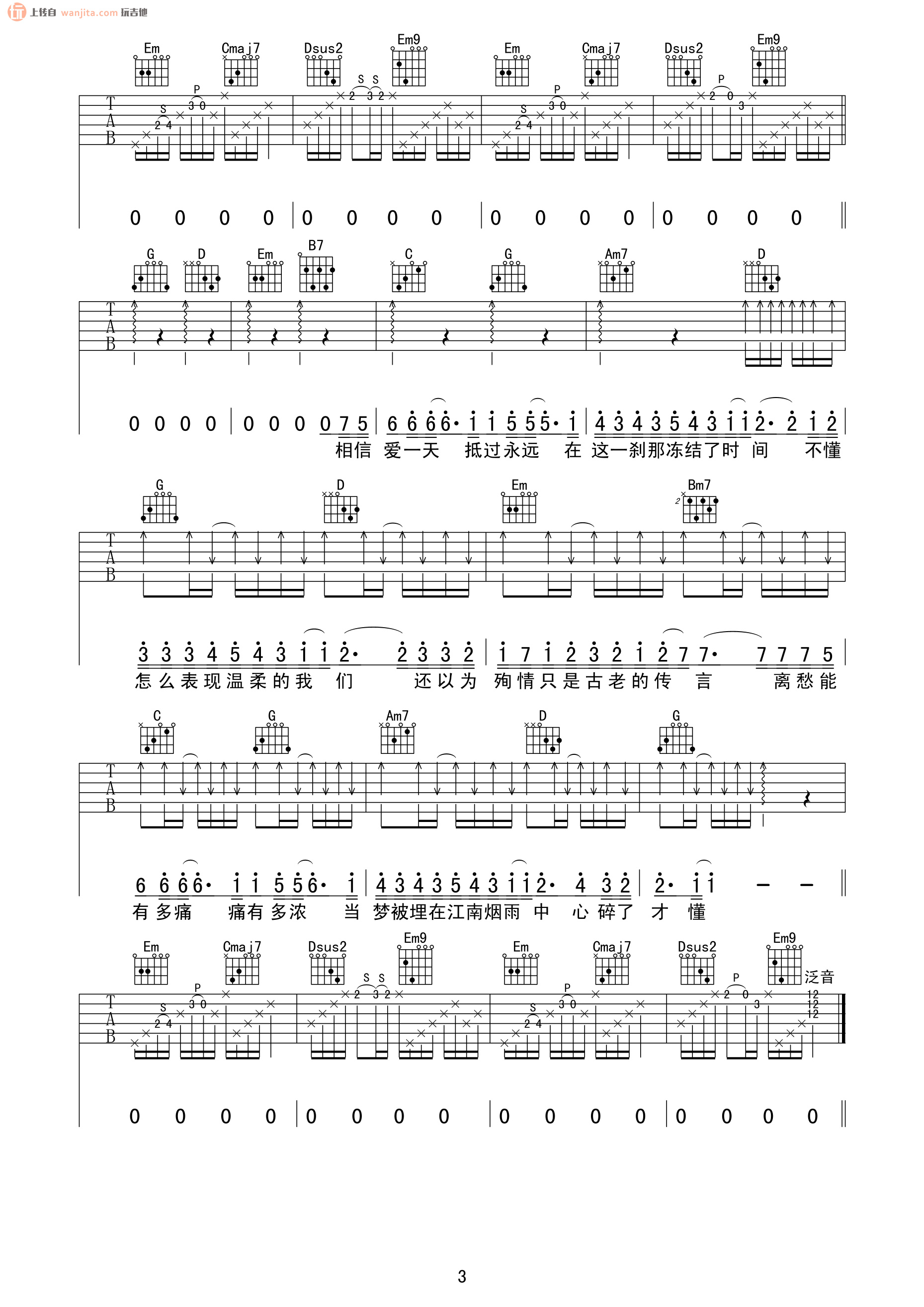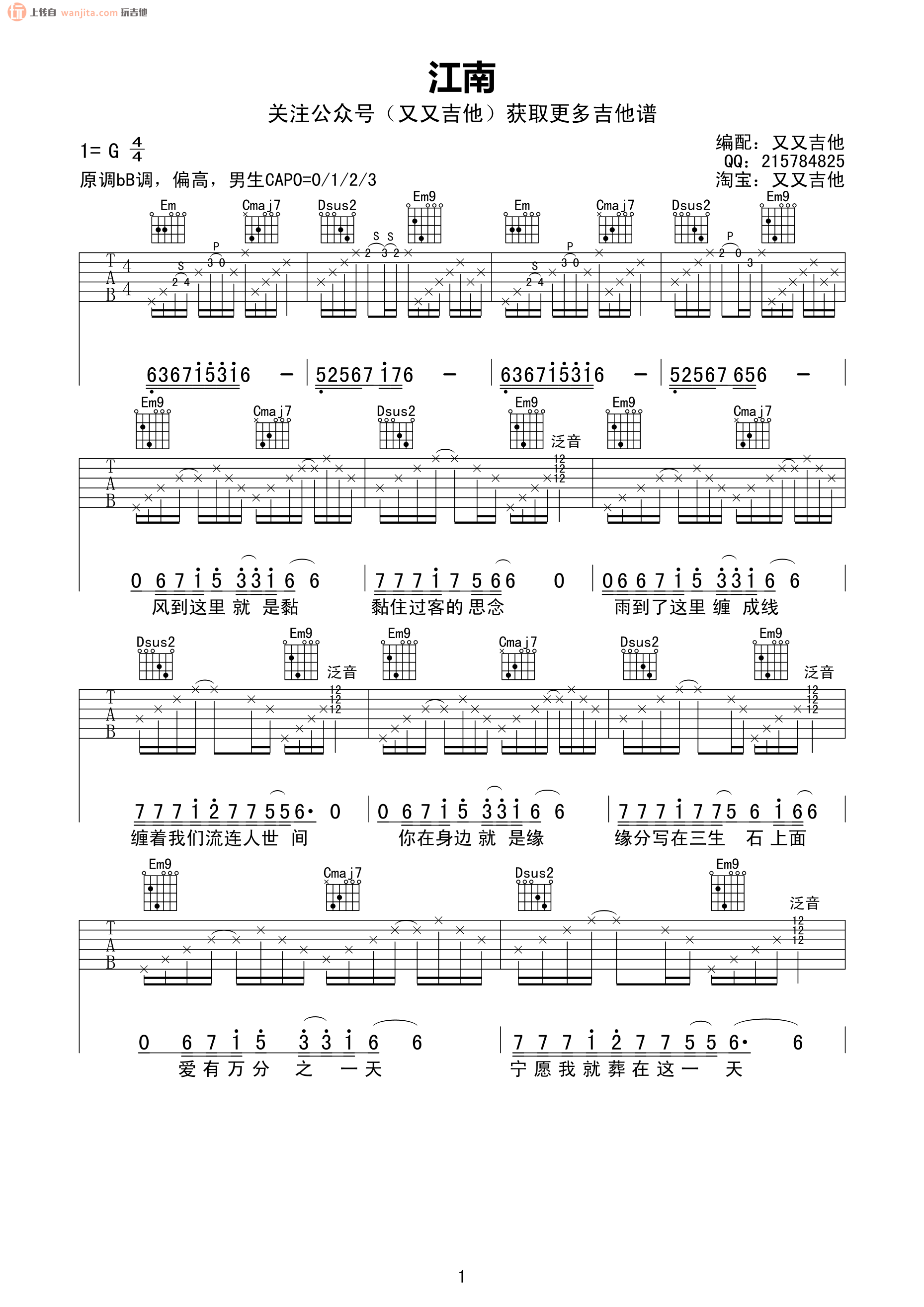 曲谱介绍: 林俊杰《江南》吉他谱的一首经典歌曲了,由又又吉他编配,原调是bB调,偏高,男声可以考虑0-3品变调夹。