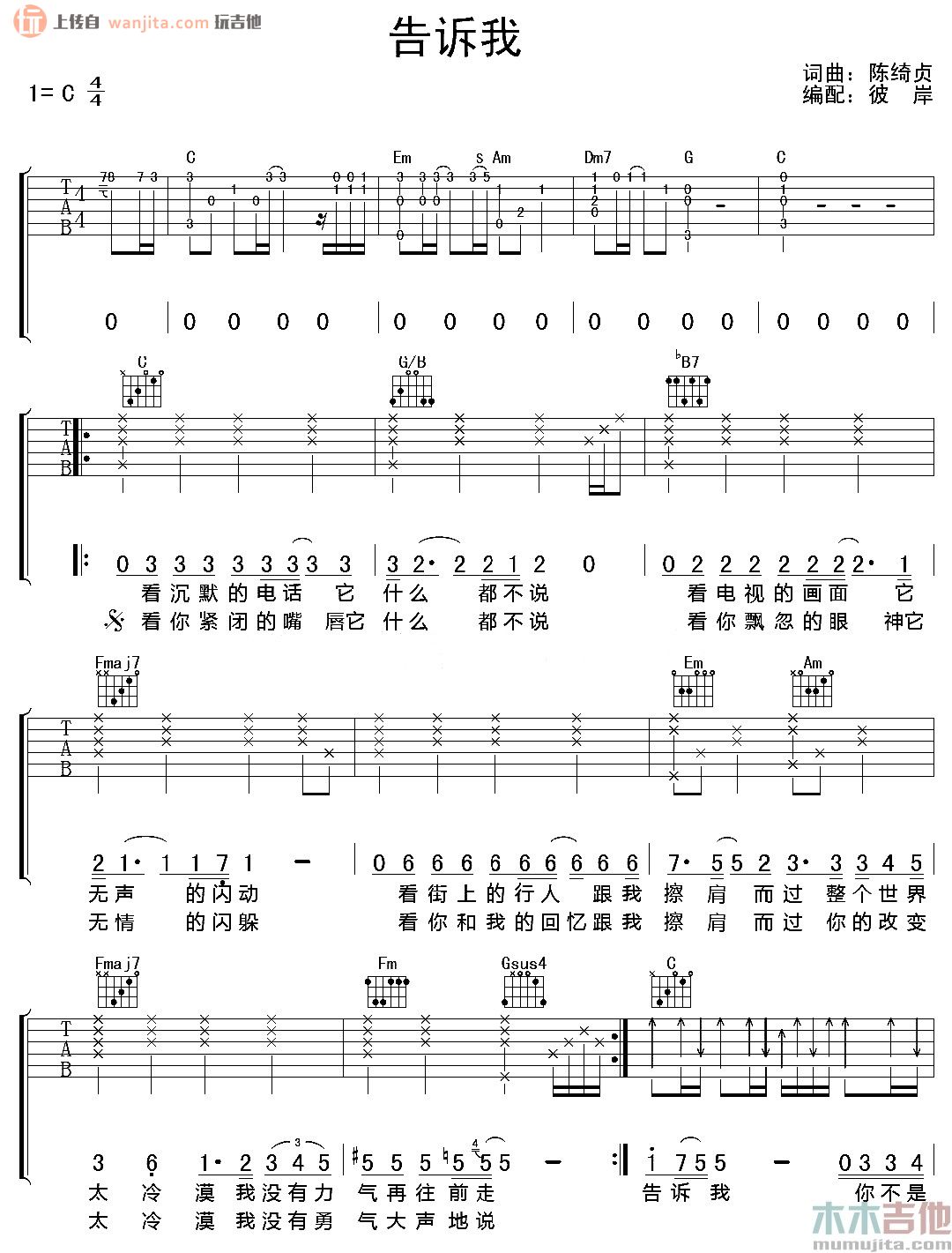 告诉我吉他谱 - 陈绮贞 - C调吉他弹唱谱