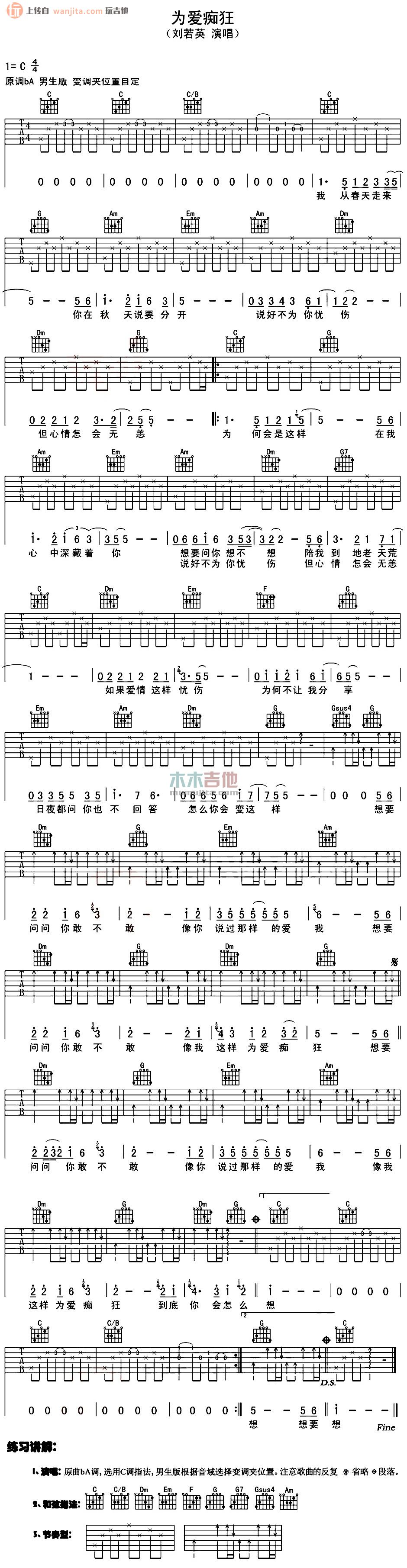 曲谱介绍: 《为爱痴狂》吉他弹唱谱,原调bA,选用C调,推荐变调夹夹2品。这张曲谱用到一些比较基础的和弦,所以新手练习起来也是比较得心应手的,需要注意的是歌曲里面对爱情的表达和看法,更多的感情和情绪存在于字里行间。