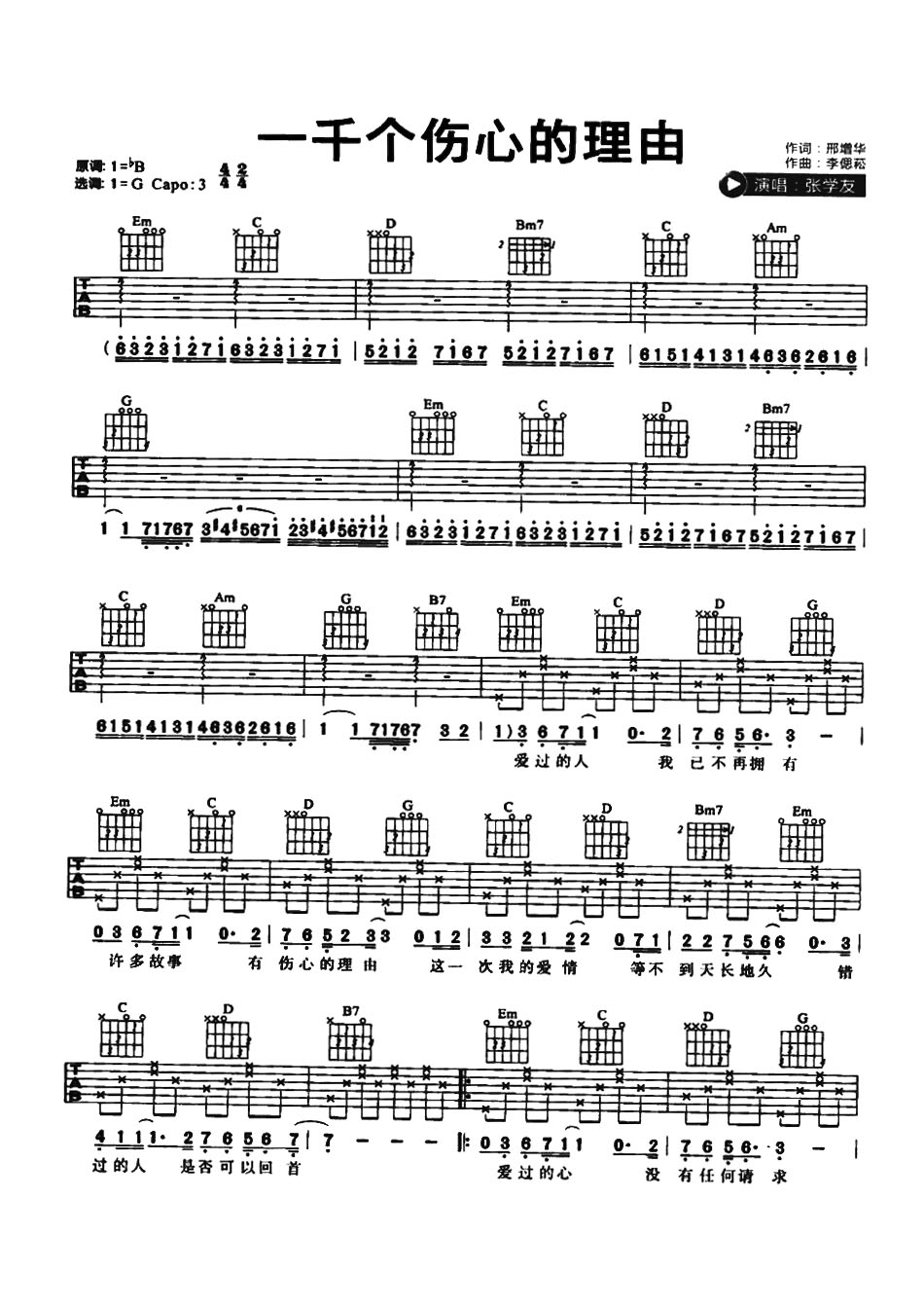 曲谱介绍: 《一千个伤心的理由》吉他谱,原调是bB调,选用G调指法编配,变调夹夹3品,即可按原调弹唱,谱子的编配比较简版,难度不大,没有像原版有复杂的编曲,所以新手也比较适合练习这首歌曲。