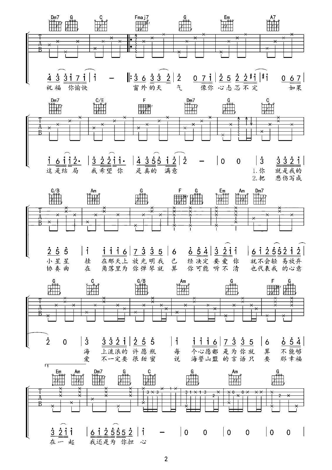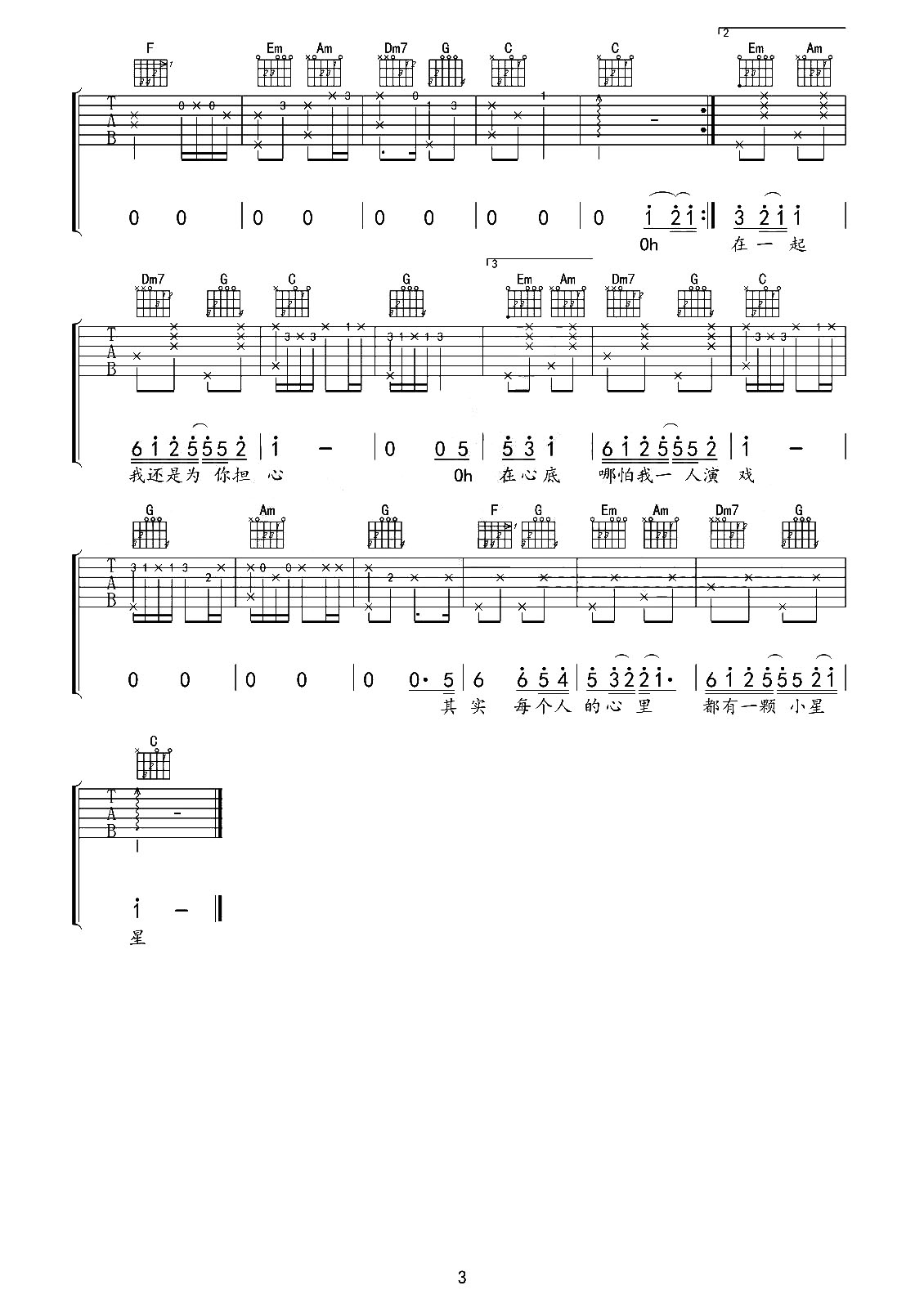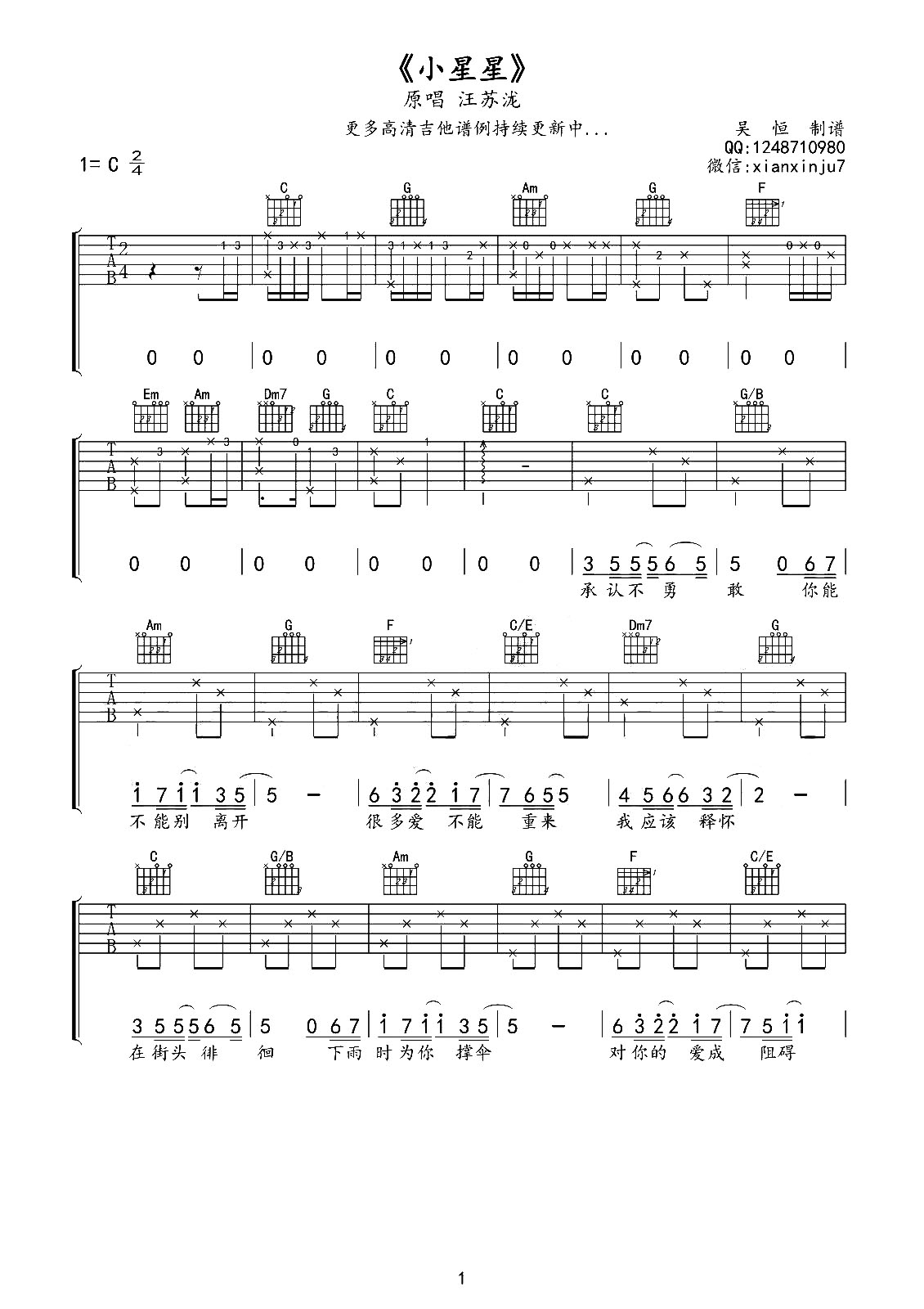曲谱介绍: 汪苏泷《小星星》吉他弹唱谱,采用C调指法编配,共有3张高清图谱。