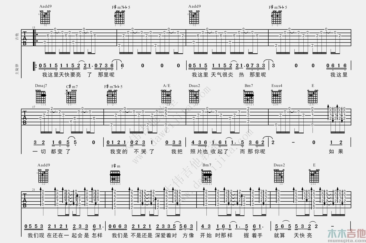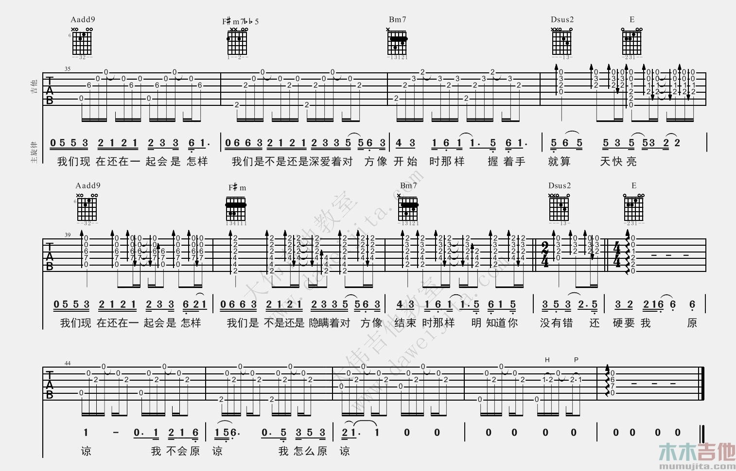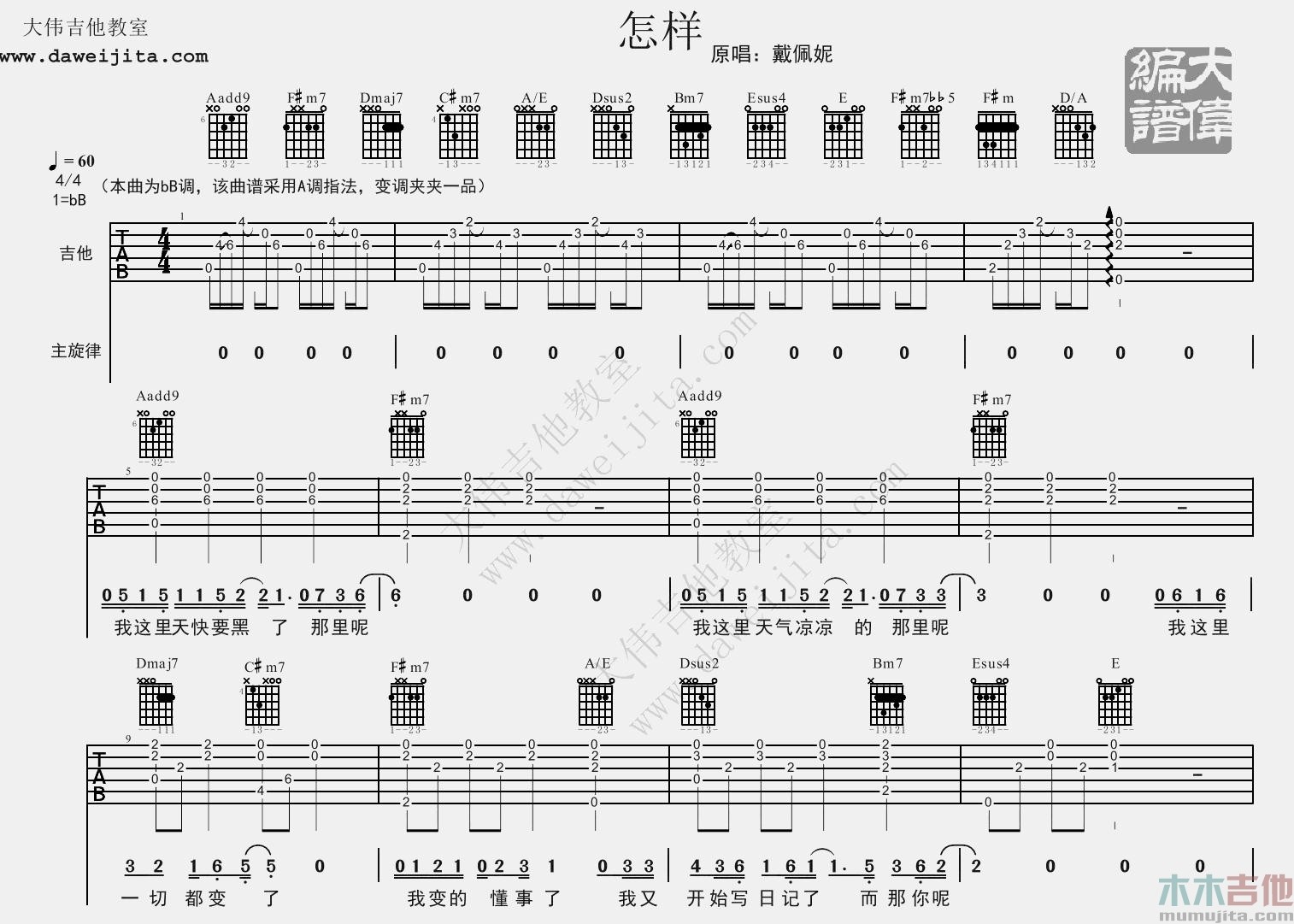 曲谱介绍: 《怎样》吉他弹唱谱,原调bB,选用A调指法,变调夹夹1品。这首感性的歌曲弹唱起来还是不太容易的,难点在于和弦的变化,歌曲情绪起伏较大,需要一定的理解,不推荐新手练习。