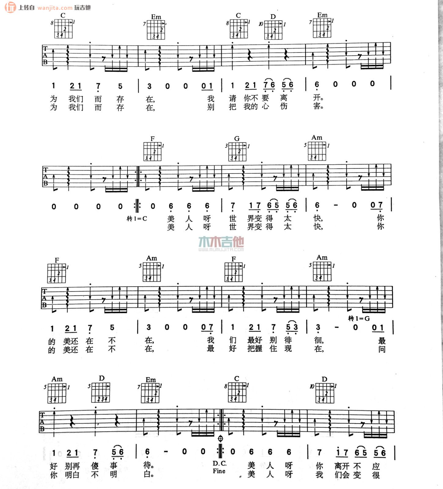 曲谱介绍: 《美人》吉他谱,总共3张高清图片谱,原调G调,选用C调,不使用变调夹。注意前奏的变化音,这首歌曲比较难以学习,不适合新手学习,这首歌曲难度较高,尤其体现在扫弦的节奏比较难以把握。