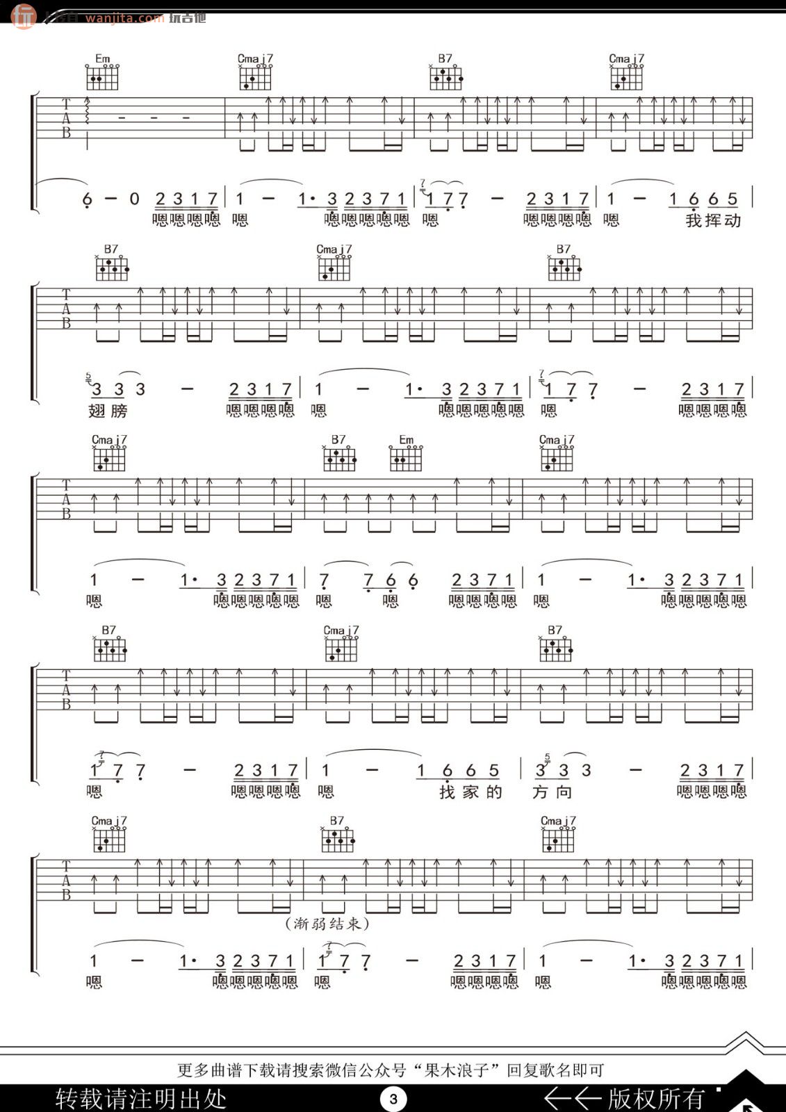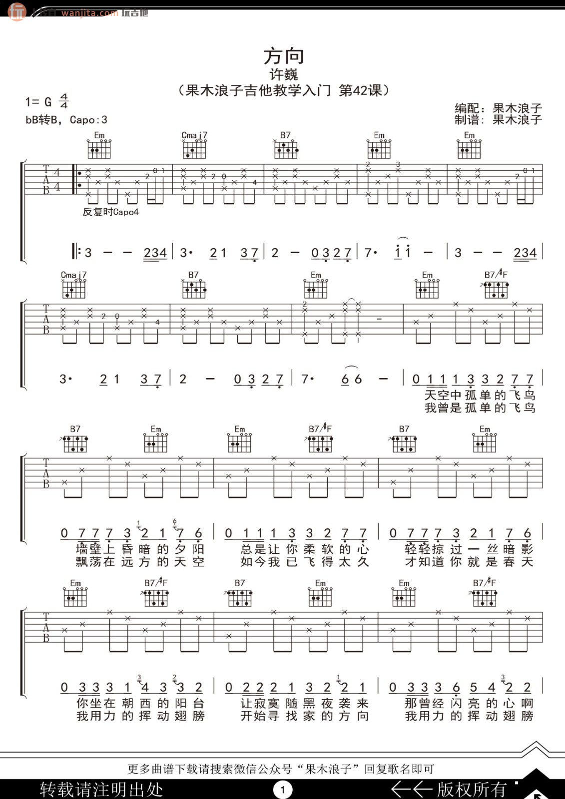 曲谱介绍: 《方向》吉他弹唱谱,总共4张高清图片谱,原调G调,bB转B,变调夹夹3品。这首歌曲弹唱起来难度一般,不推荐新手学习,弹唱时需要注意歌曲的前奏部分右手的节奏,建议练习的时候开着节拍器。