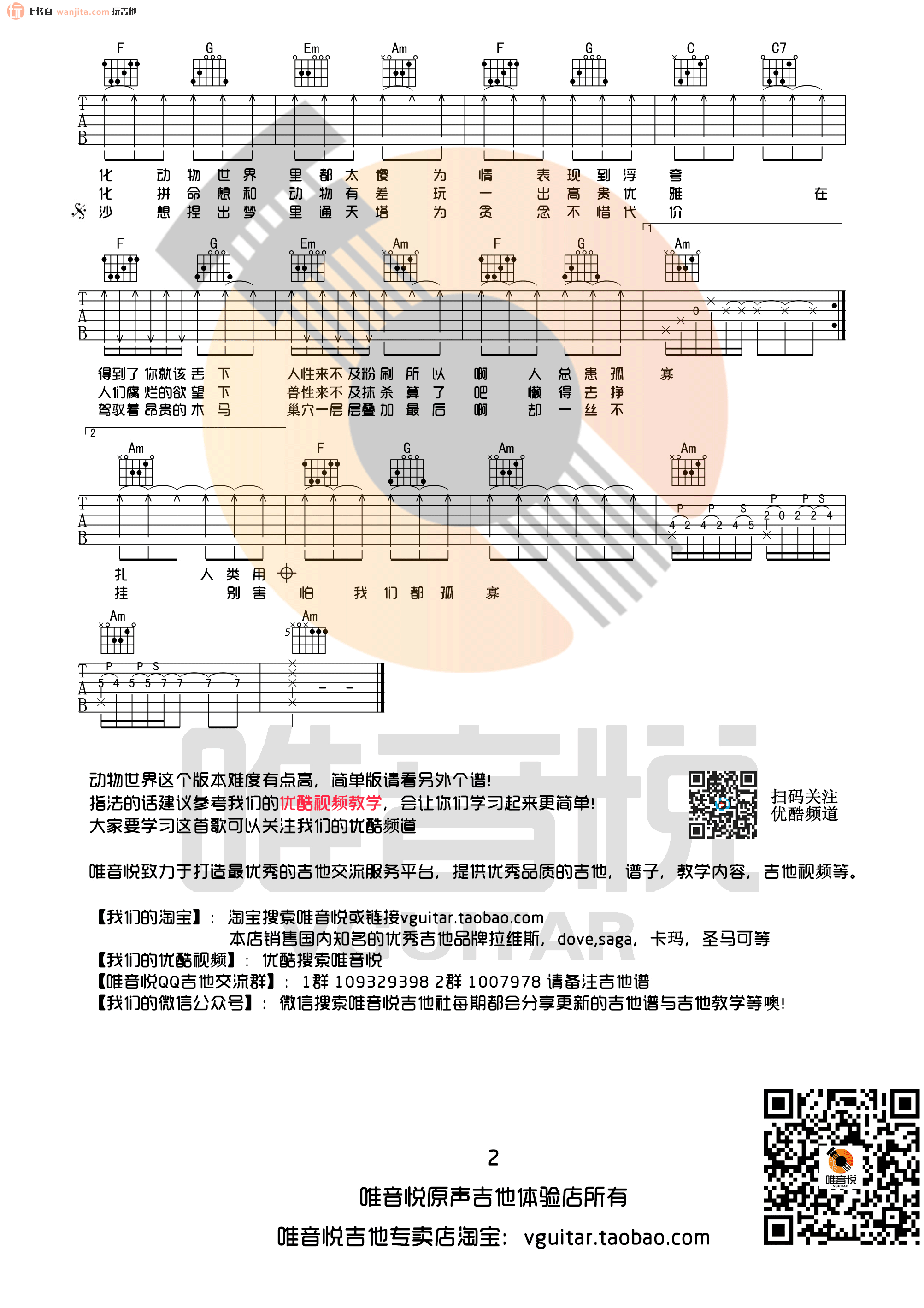 曲谱介绍: 《动物世界》吉他谱,原调F调,选用C调,变调夹夹5品。这首现实的歌曲比较难以学习,不推荐新手学习,用到了一些吉他技巧,适合进阶练习的一张谱子,练习的时候需要注意歌曲的前奏和间奏。总共2张高清图片谱例,由唯音乐制谱分享。 《动物世界》吉他弹唱演示