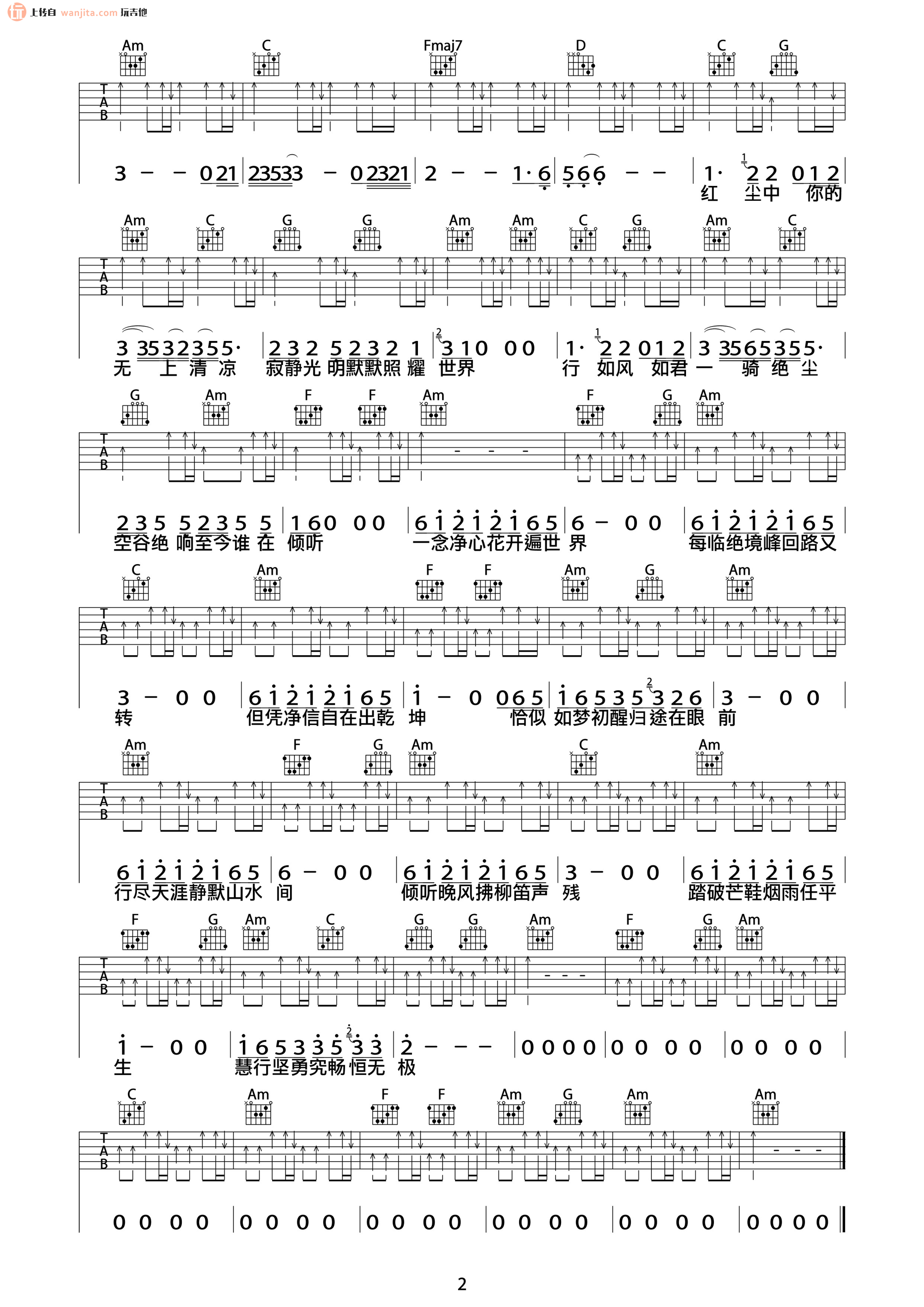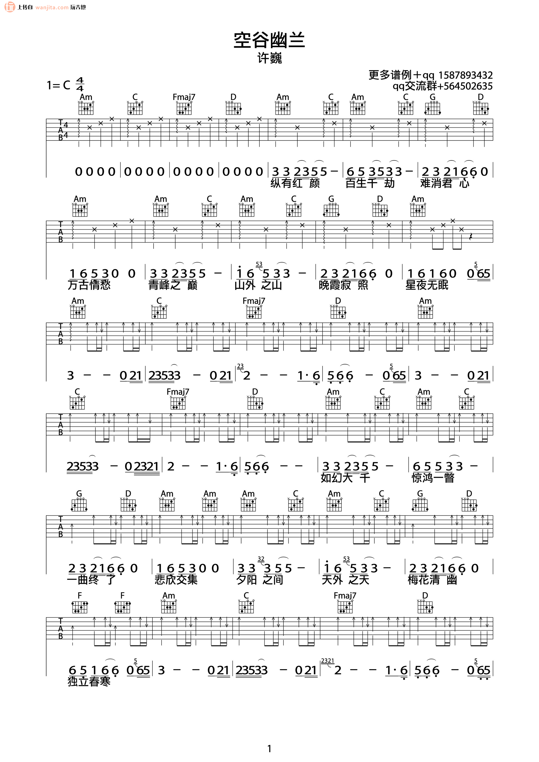 曲谱介绍: 许巍《空谷幽兰》吉他弹唱谱,采用C调指法编配原版,共有2张高清图谱,免翻页排版设计。