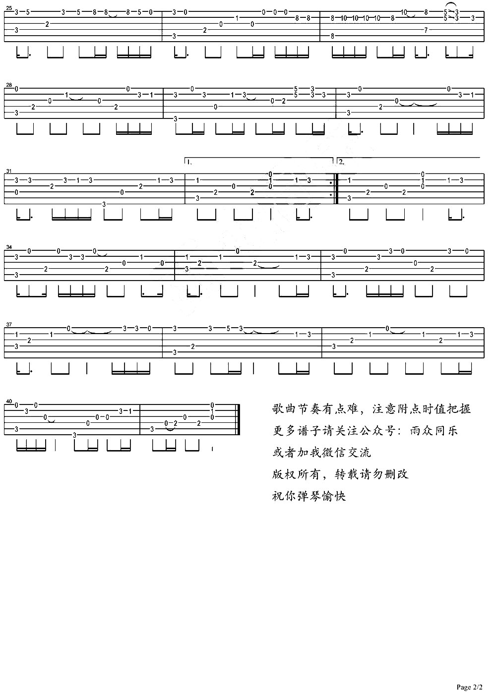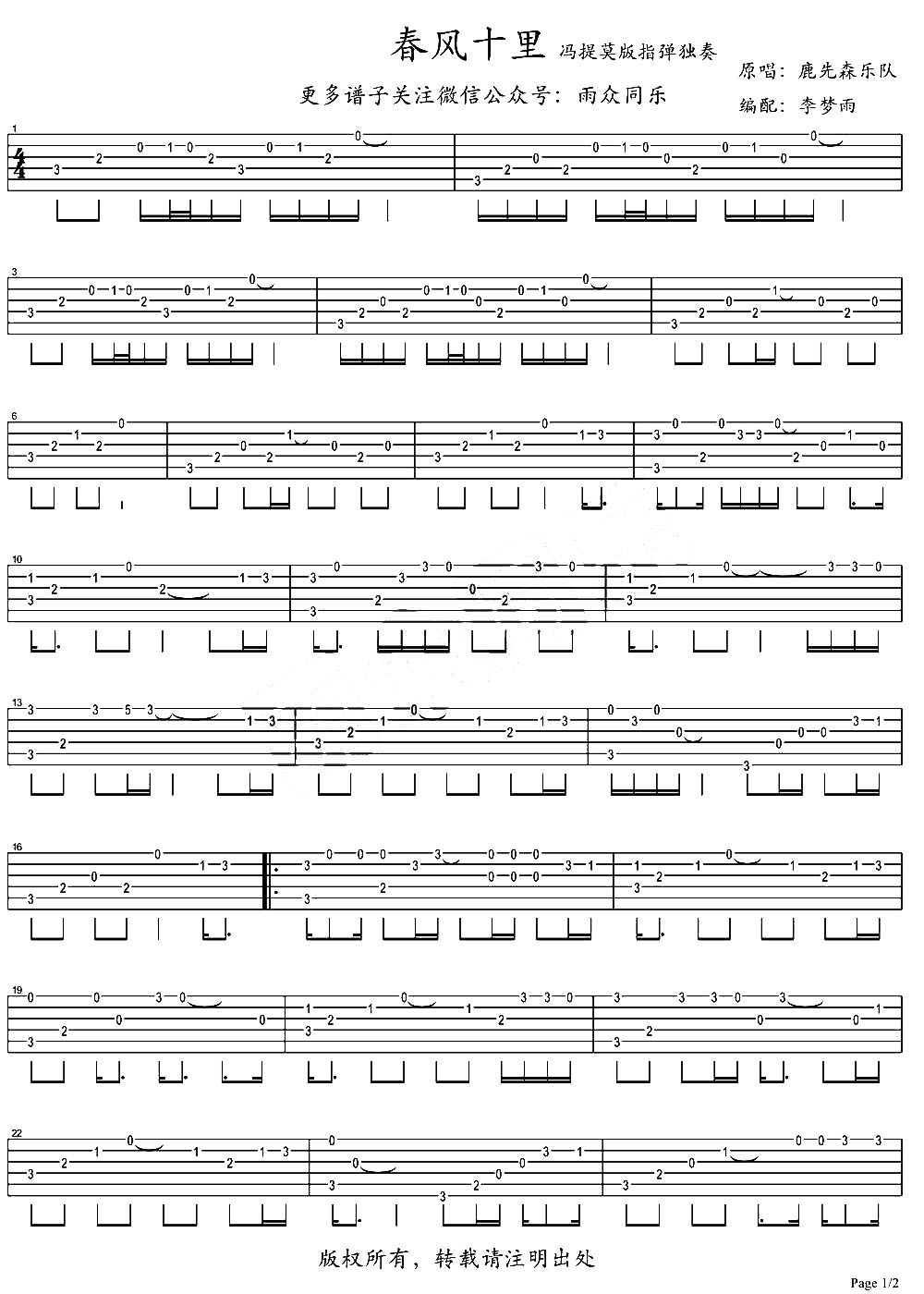 曲谱介绍: 冯提莫《春风十里》吉他独奏谱,共有2张高清图谱,免翻页排版设计。