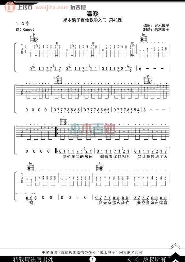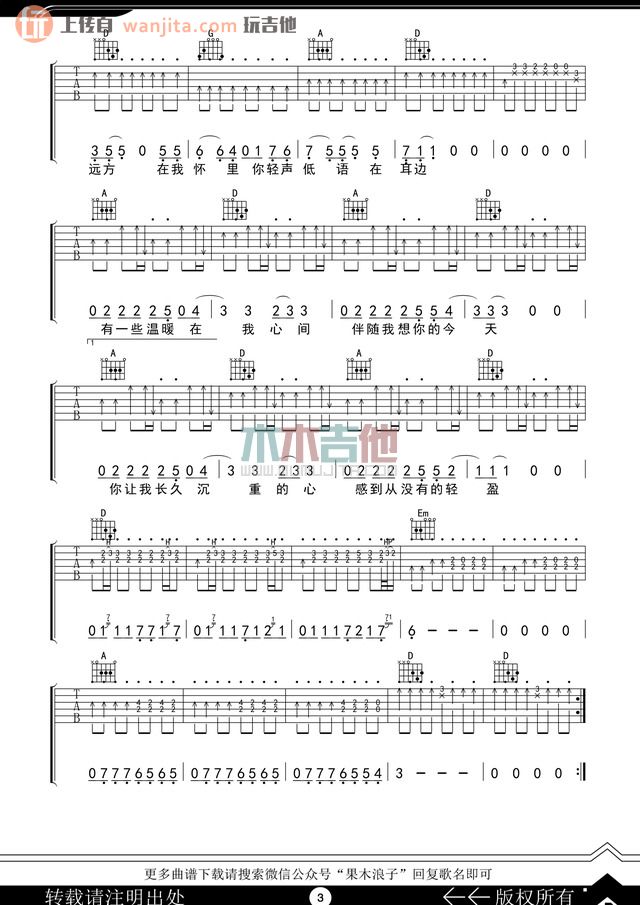 曲谱介绍: 许巍《温暖》吉他弹唱谱,采用D调指法编配,共有4张高清图谱。