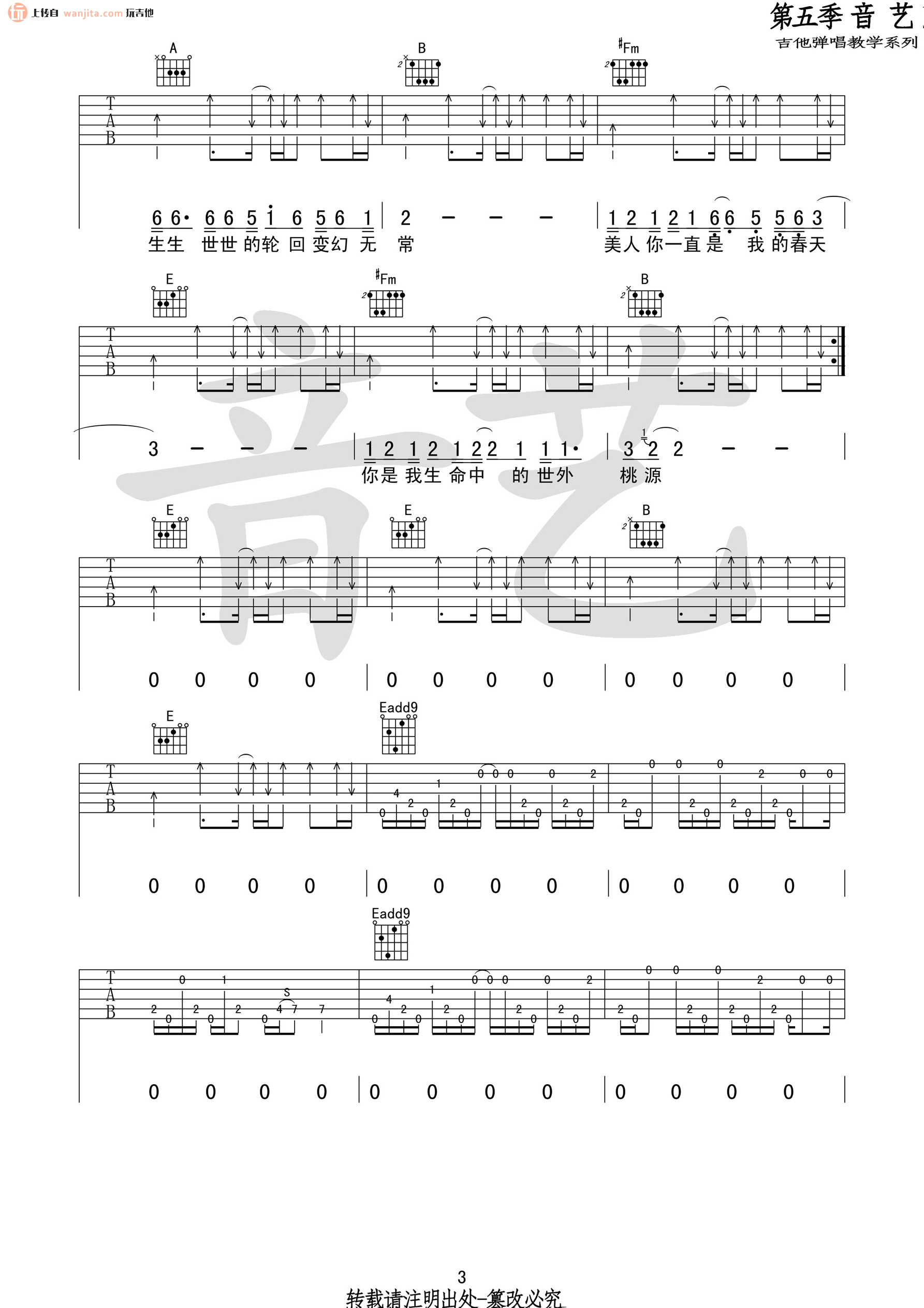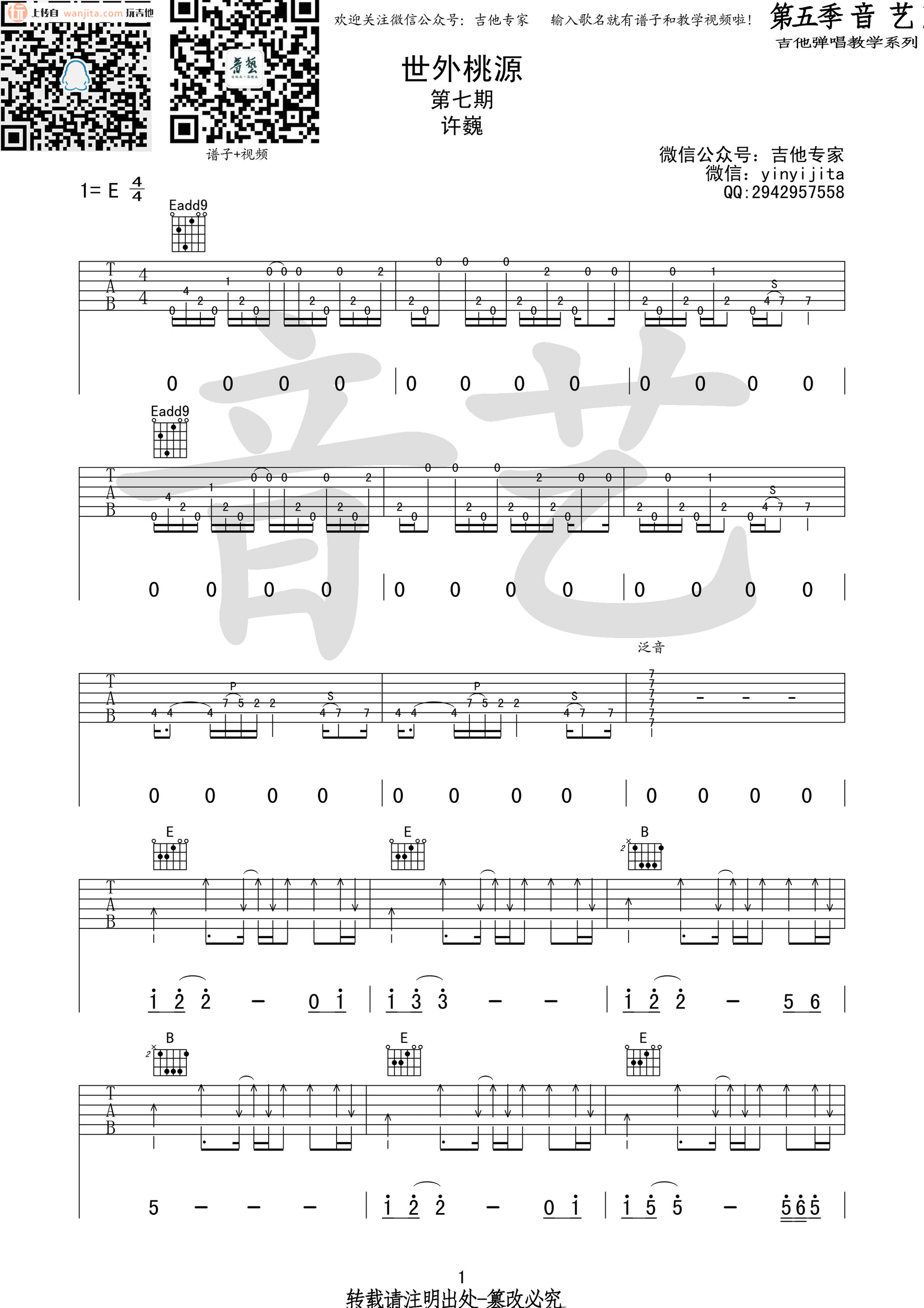曲谱介绍: 许巍《世外桃源》吉他弹唱谱,采用E调指法编配,共有4张高清图谱。