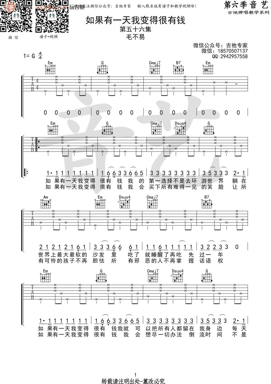 如果有一天我变得很有钱吉他谱 - 毛不易 - G调吉他弹唱谱