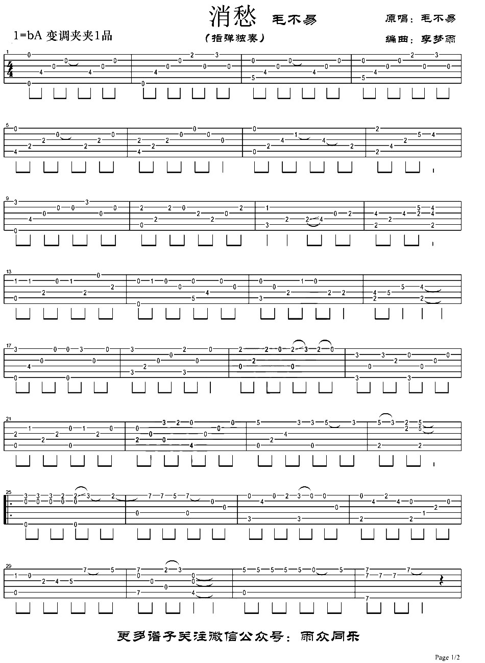 曲谱介绍: 消愁吉他指弹谱,总共2张高清图片谱,原调是降B调,弹唱建议变调夹夹1品,弹唱难度初级。
