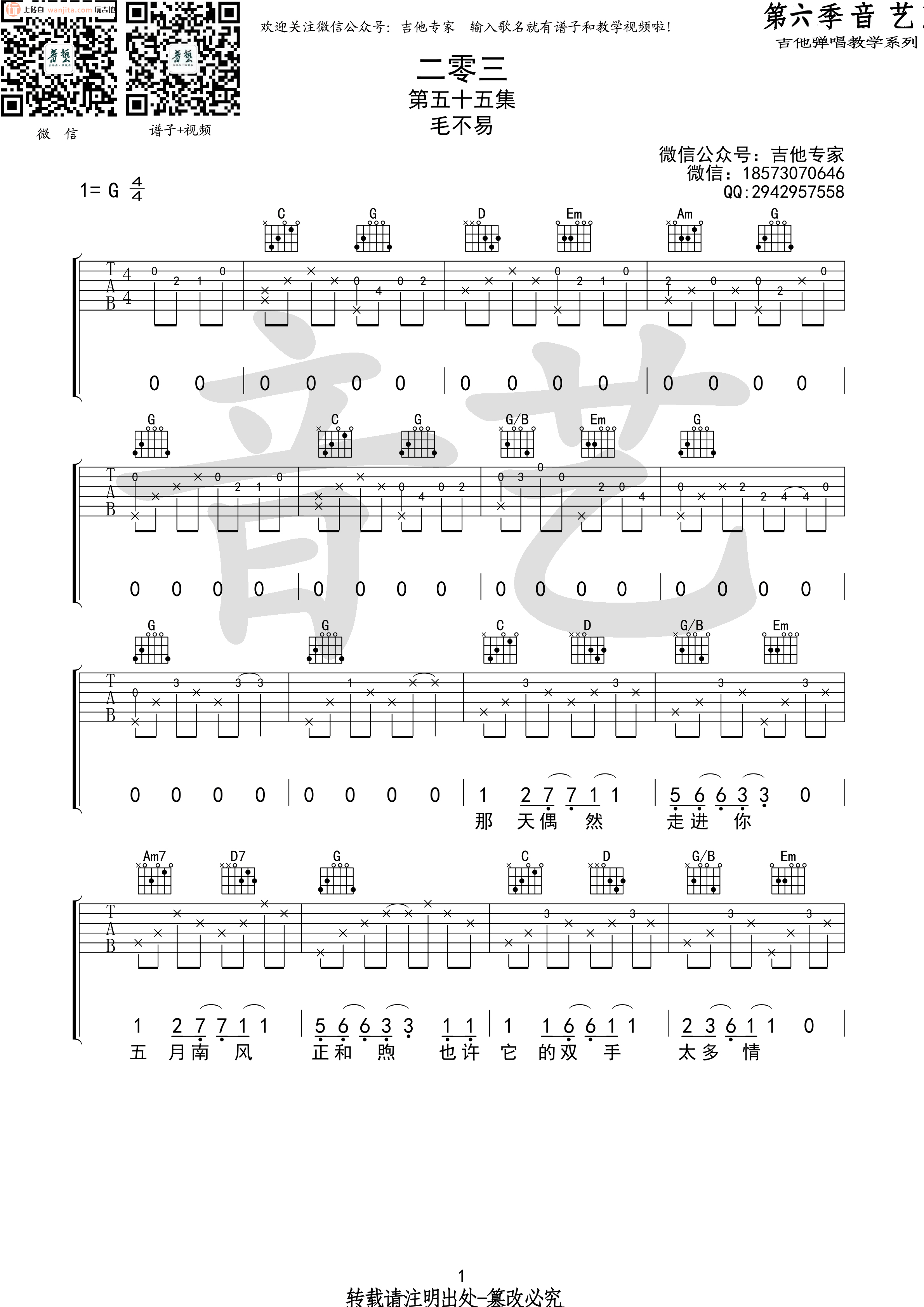 曲谱介绍: 毛不易《二零三》吉他弹唱谱,采用G调指法编配,共有3张高清图谱。