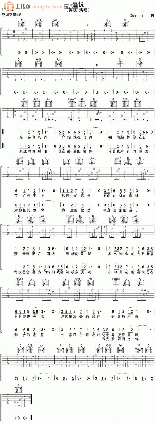 曲谱介绍: 许巍《喜悦》吉他弹唱谱,采用F调指法编配,共有1张高清图谱,免翻页排版设计。