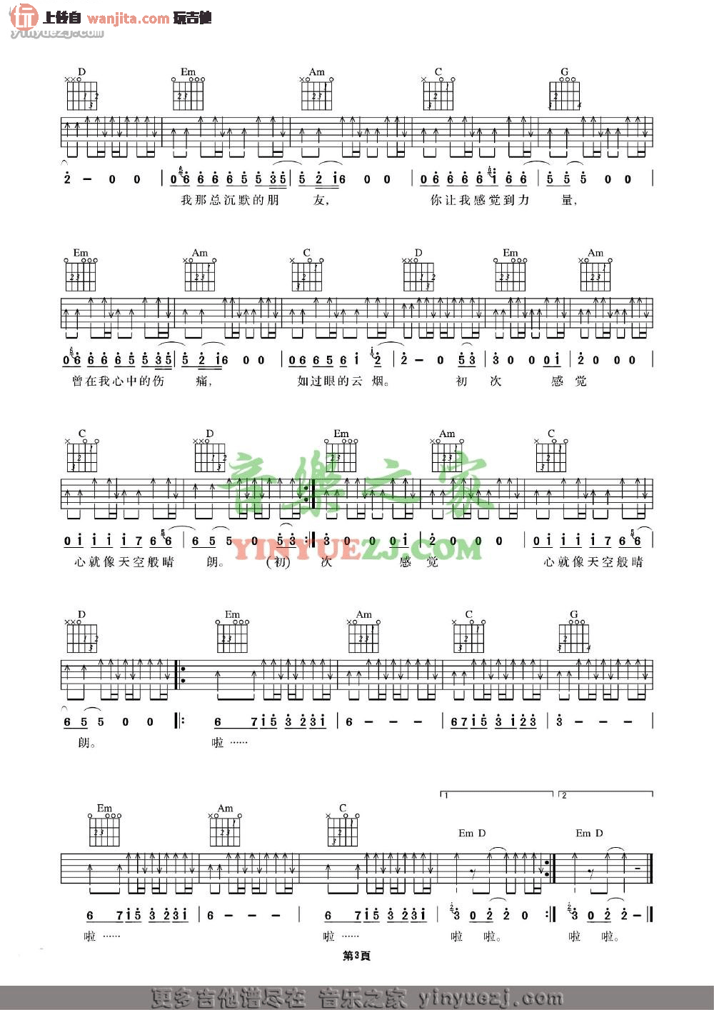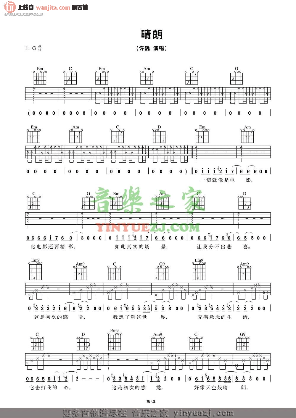曲谱介绍: 许巍《晴朗》吉他弹唱谱,采用G调指法编配原版,共有3张高清图谱。