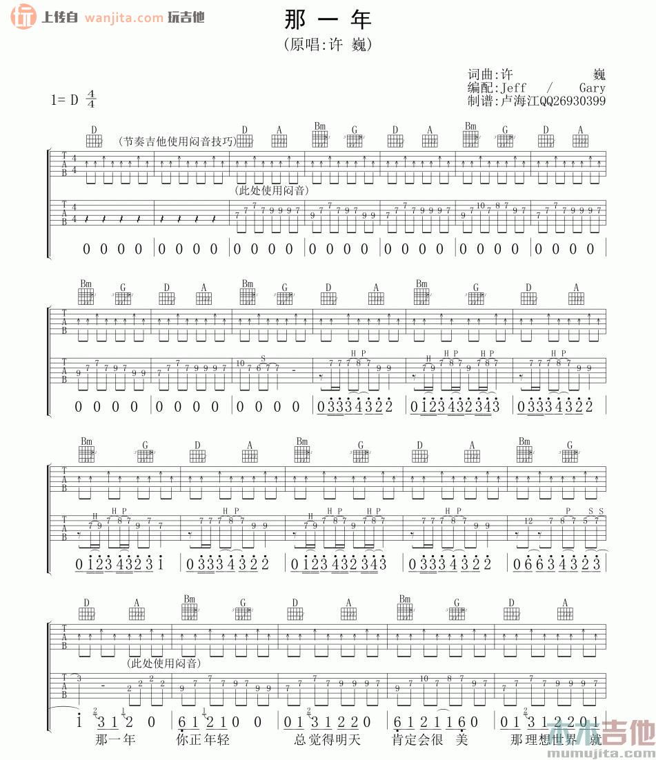 曲谱介绍: 许巍《那一年》吉他谱,总共4张高清图片谱,原调是D调,节拍4/4拍,不使用变调夹,弹唱难度初级,本谱由卢海江编配制谱。