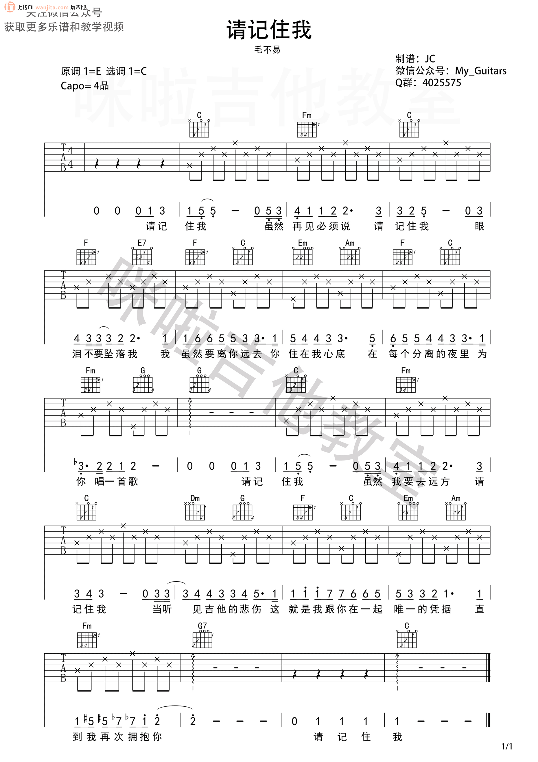 曲谱介绍: 毛不易《请记住我》吉他弹唱谱,采用C调指法编配,共有1张高清图谱,免翻页排版设计。