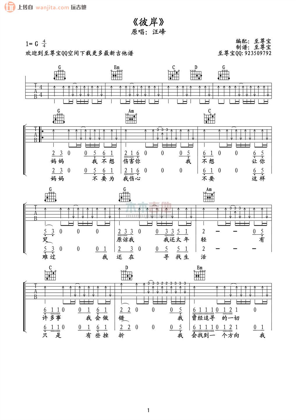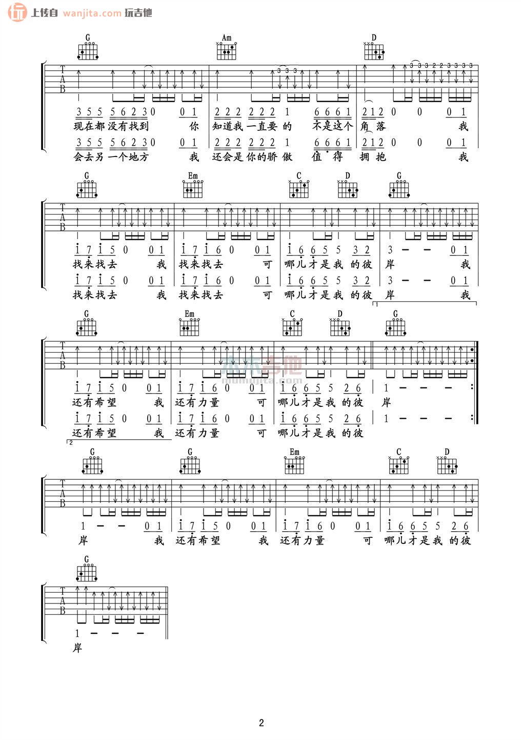 曲谱介绍: 汪峰彼岸吉他谱,总共2张高清图片谱,选用G调指法,节拍4/4拍,不使用变调夹,弹唱难度初级。
