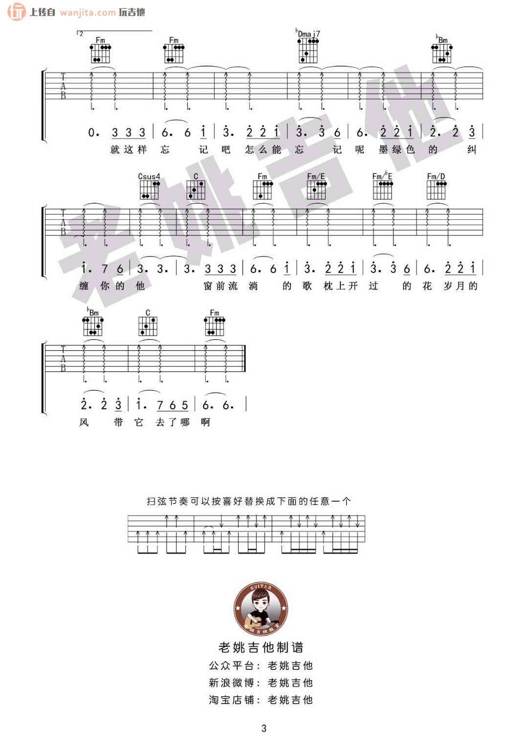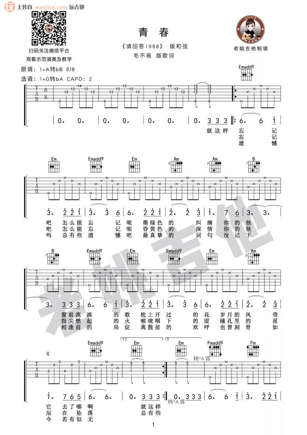 曲谱介绍: 青春吉他谱,总共3张高清图片谱,原调为A调转降B调,选用G调转降A指法,节拍6/8拍,弹唱建议变调夹夹2品,弹唱难度中级,来自老姚吉他编配制谱。
