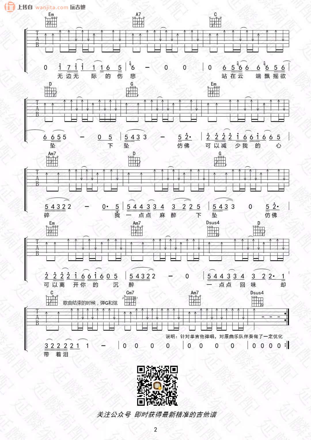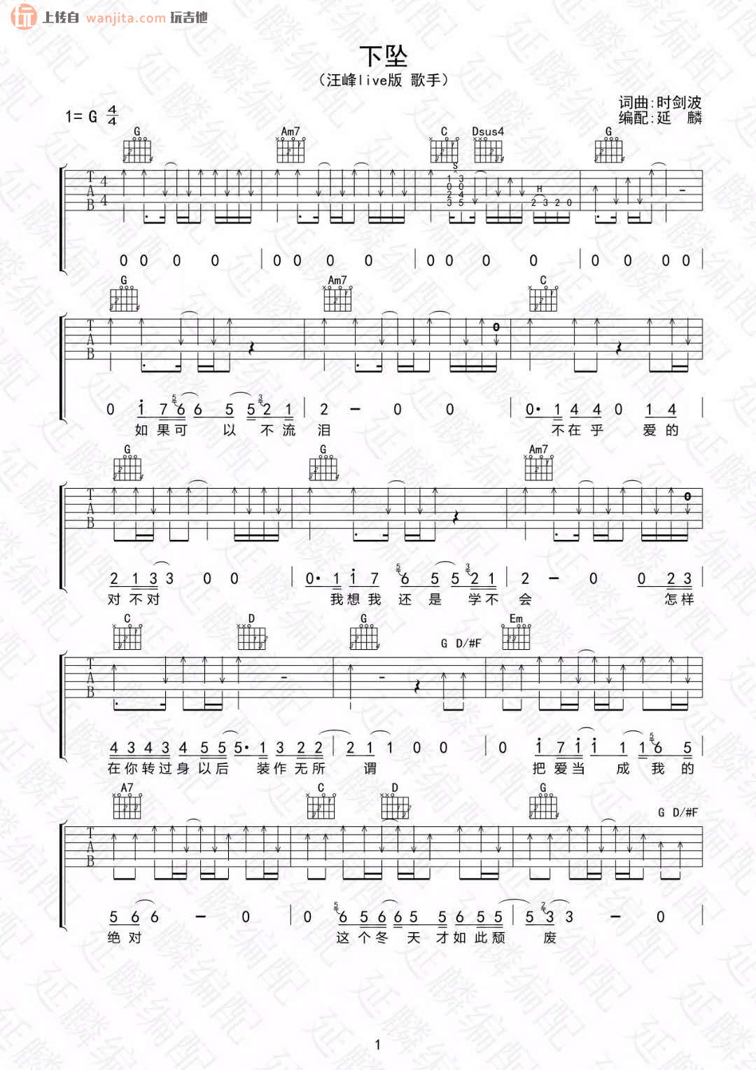 曲谱介绍: 汪峰下坠吉他谱,总共2张高清图片谱,原调为G调,节拍4/4拍,不使用变调夹,弹唱难度初级。