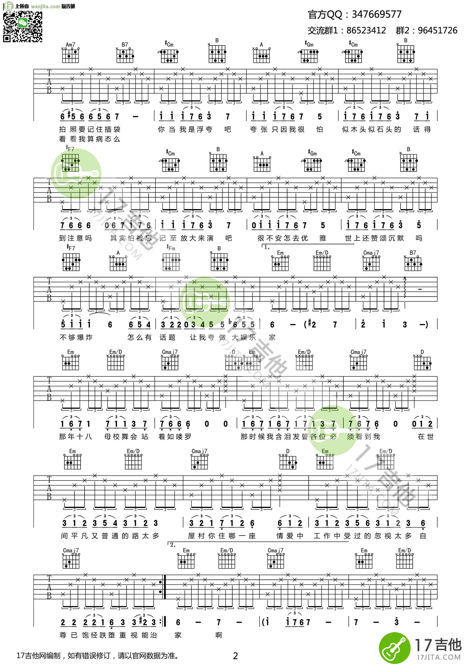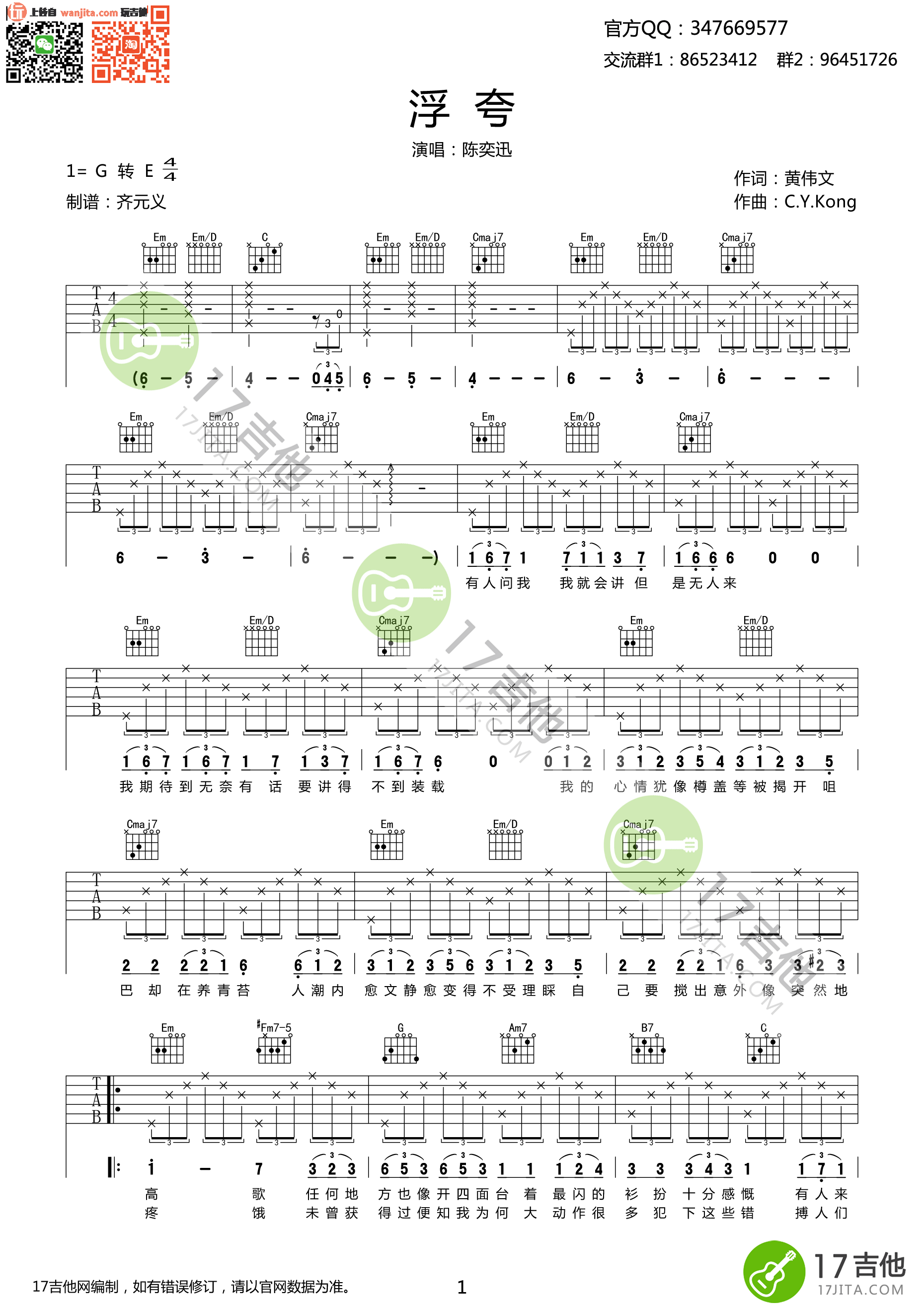 曲谱介绍: 浮夸吉他谱,总共2张高清图片谱,原调为G调转为E调,节拍4/4拍,不使用变调夹,弹唱难度初级。