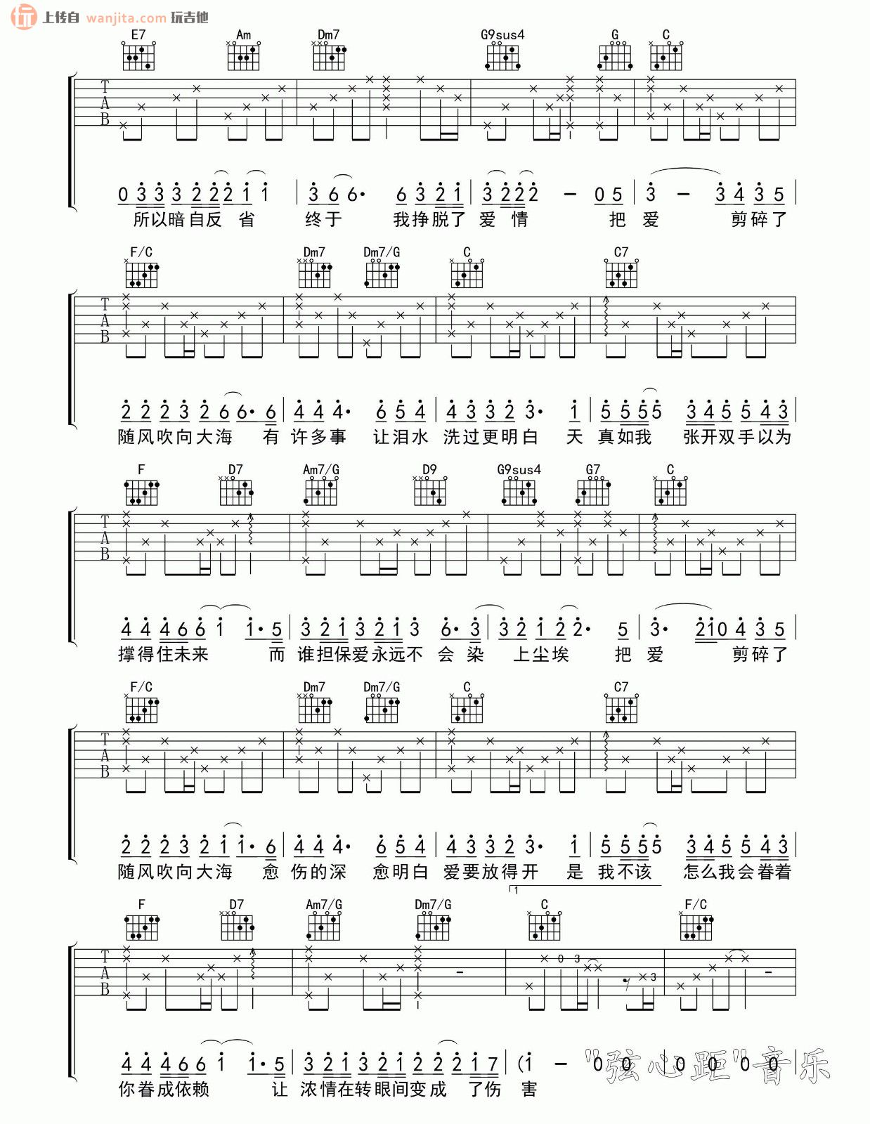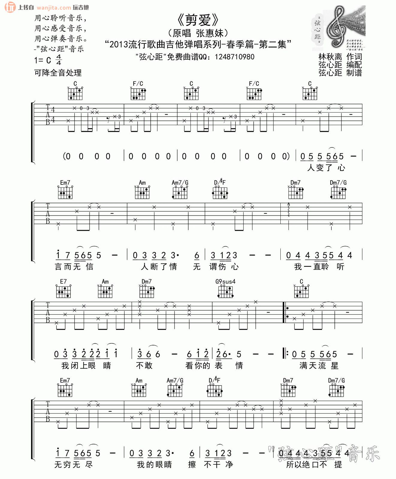 曲谱介绍: 张惠妹《剪爱》吉他弹唱谱,采用C调指法编配,共有3张高清图谱。