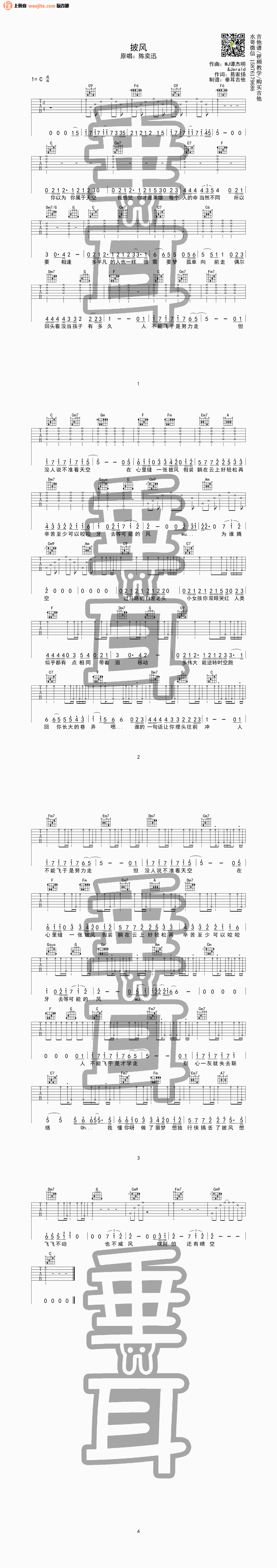 曲谱介绍: 披风吉他谱,总共1张高清图片谱,原调为C调,节拍4/4拍,不使用变调夹,弹唱难度初级。