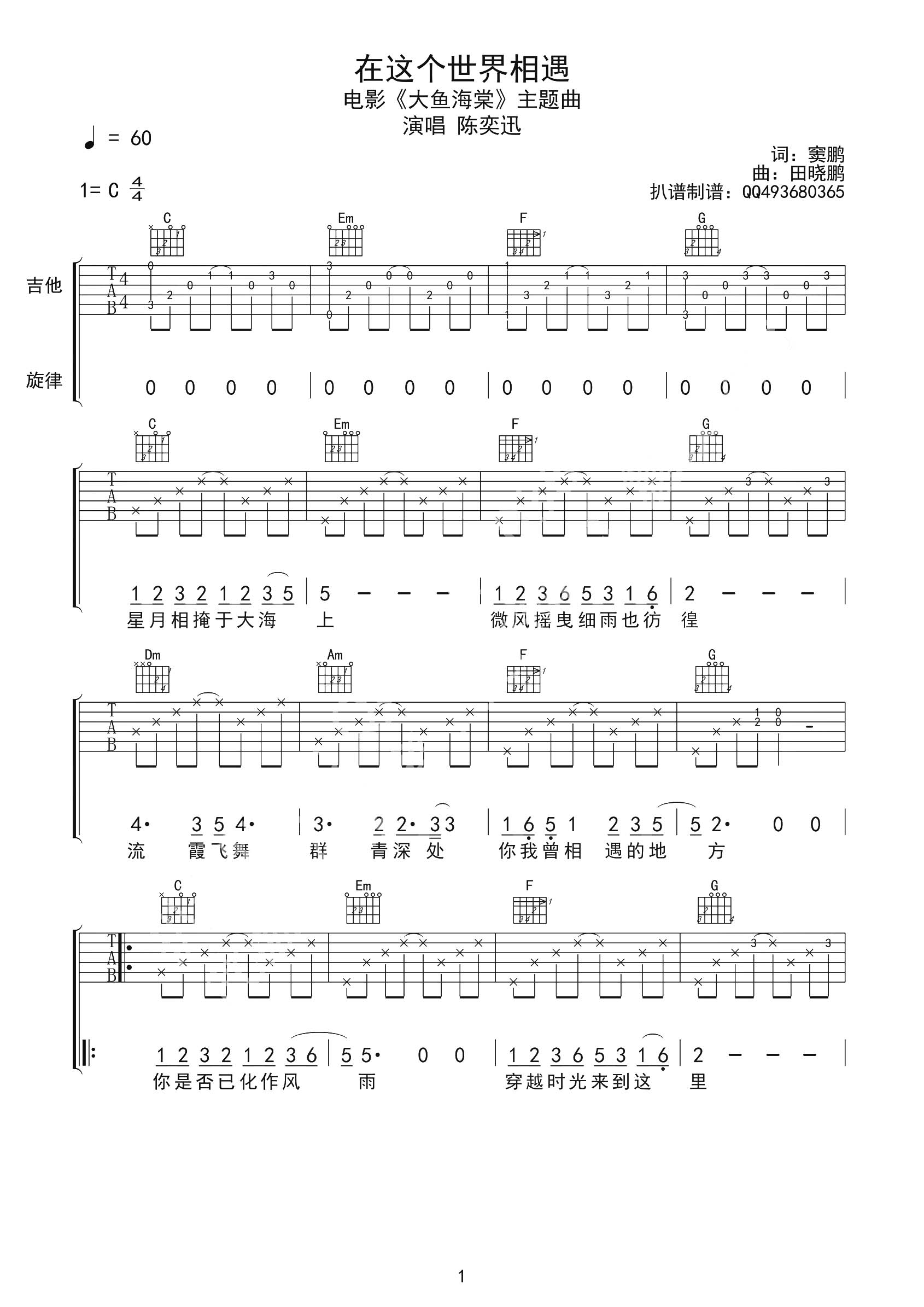 曲谱介绍: 陈奕迅《在这个世界相遇》吉他弹唱谱,采用C调指法编配,共有3张高清图谱。