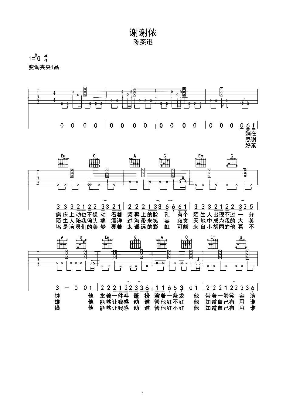 曲谱介绍: 陈奕迅《谢谢侬》吉他弹唱谱,采用G调指法编配,共有3张高清图谱。