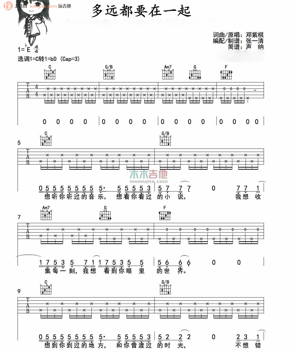 曲谱介绍: 多远都要在一起吉他谱,总共5张高清图片谱,原调为降E调,选用C调转降D调,节拍4/4拍,弹唱建议变调夹夹3品,弹唱难度中级。