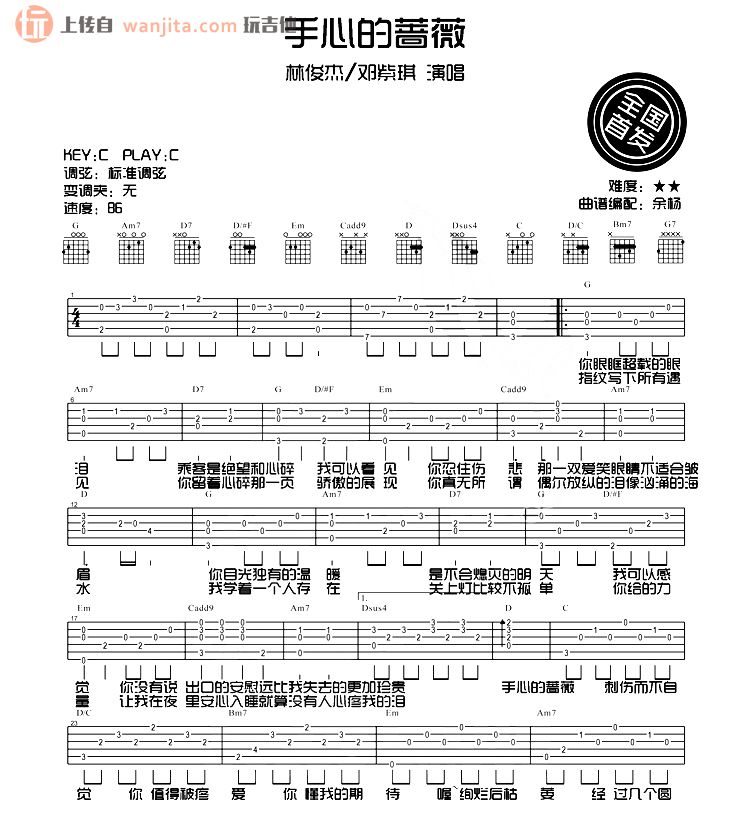 曲谱介绍: 邓紫棋,林俊杰《手心的蔷薇》吉他弹唱谱,采用C调指法编配,共有3张高清图谱。