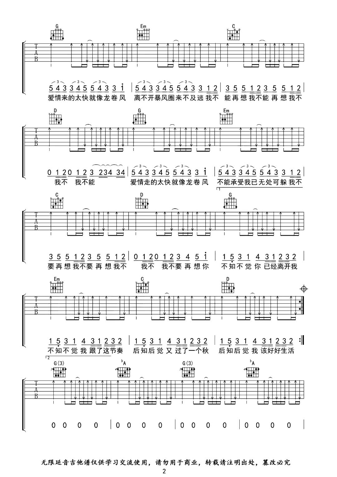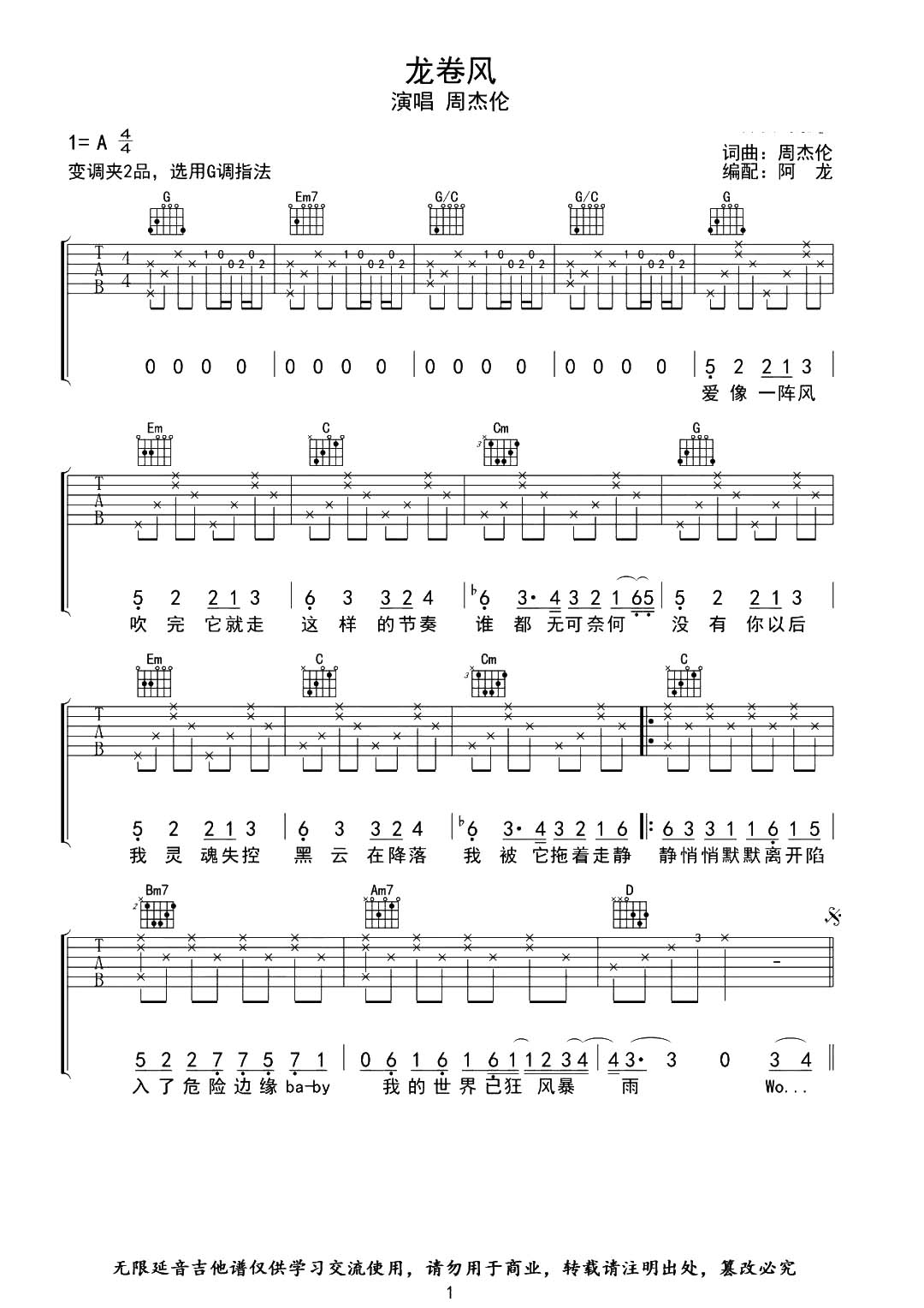 曲谱介绍: 邓紫棋《龙卷风》吉他弹唱谱,采用G调指法编配,共有3张高清图谱。
