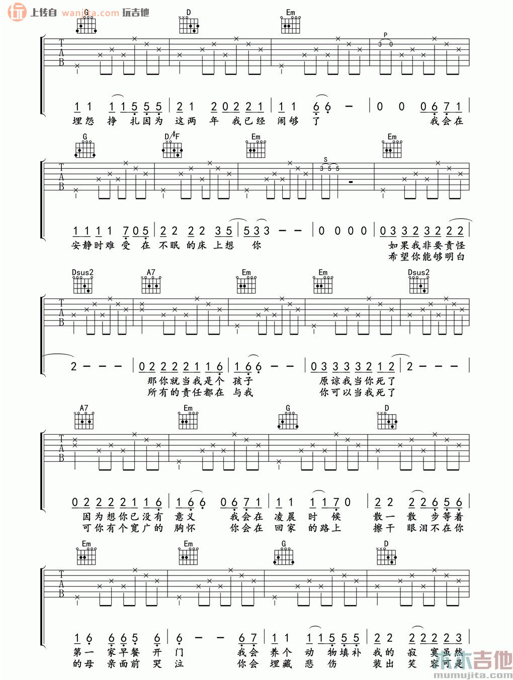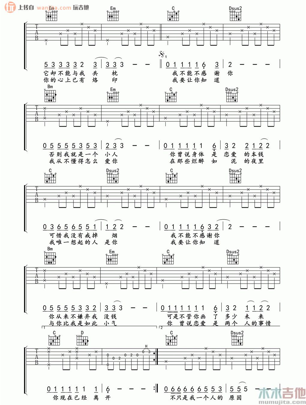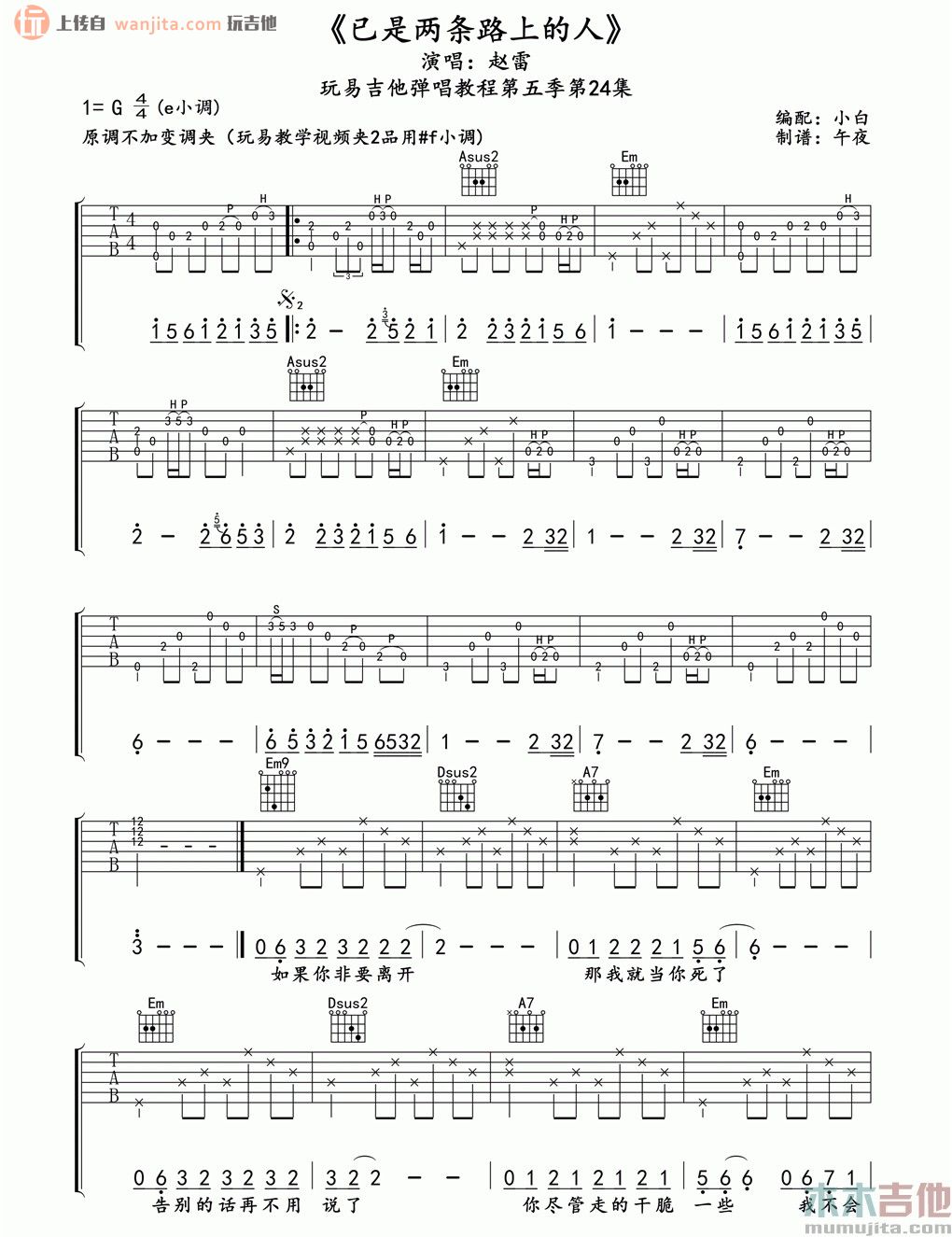 曲谱介绍: 《已是两条路上的人》吉他谱,总共3张高清图片谱,原调为G调,节拍4/4拍,原调不使用变调夹,吉他谱变调夹夹2品,用#f小调,弹唱难度中级。
