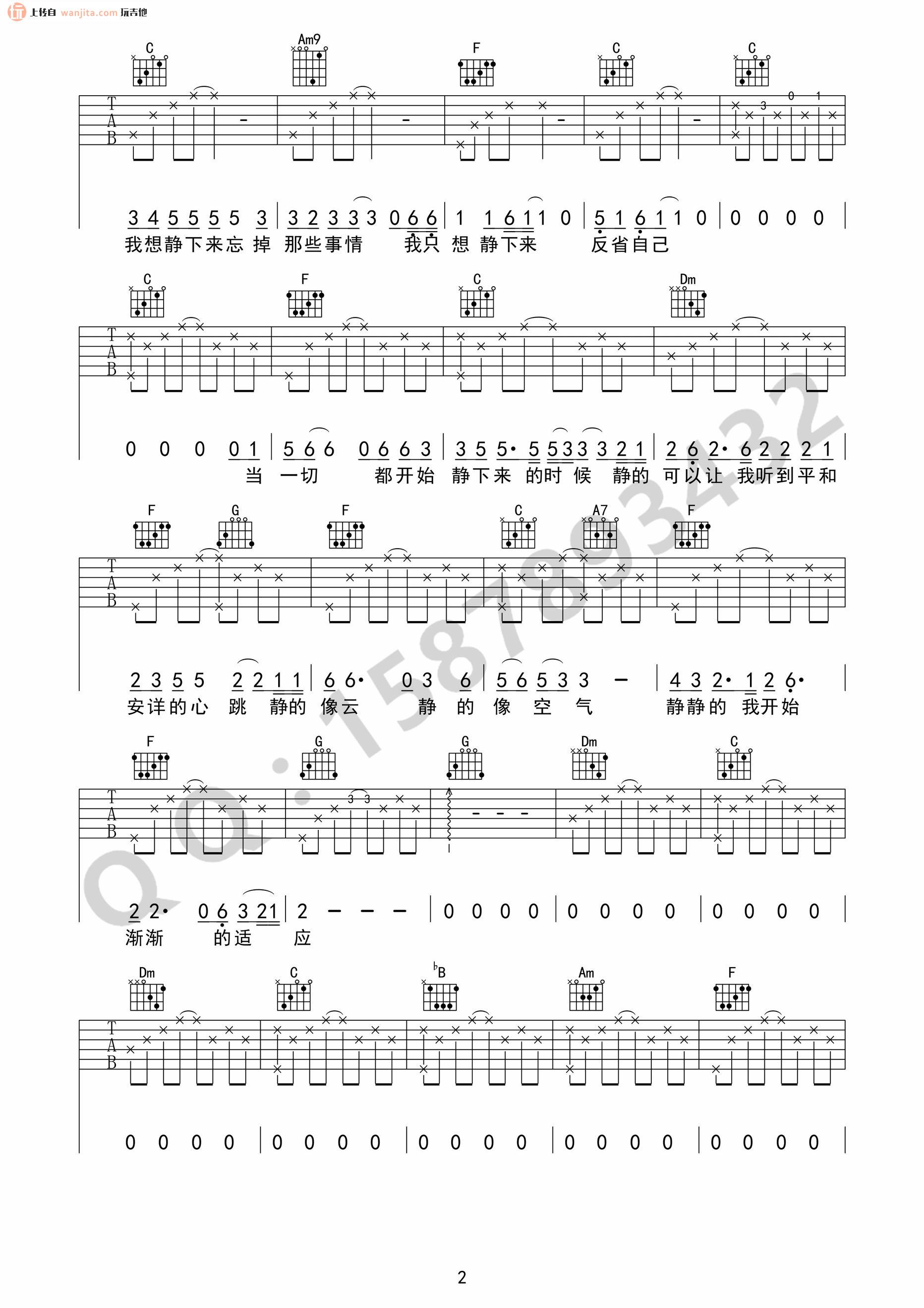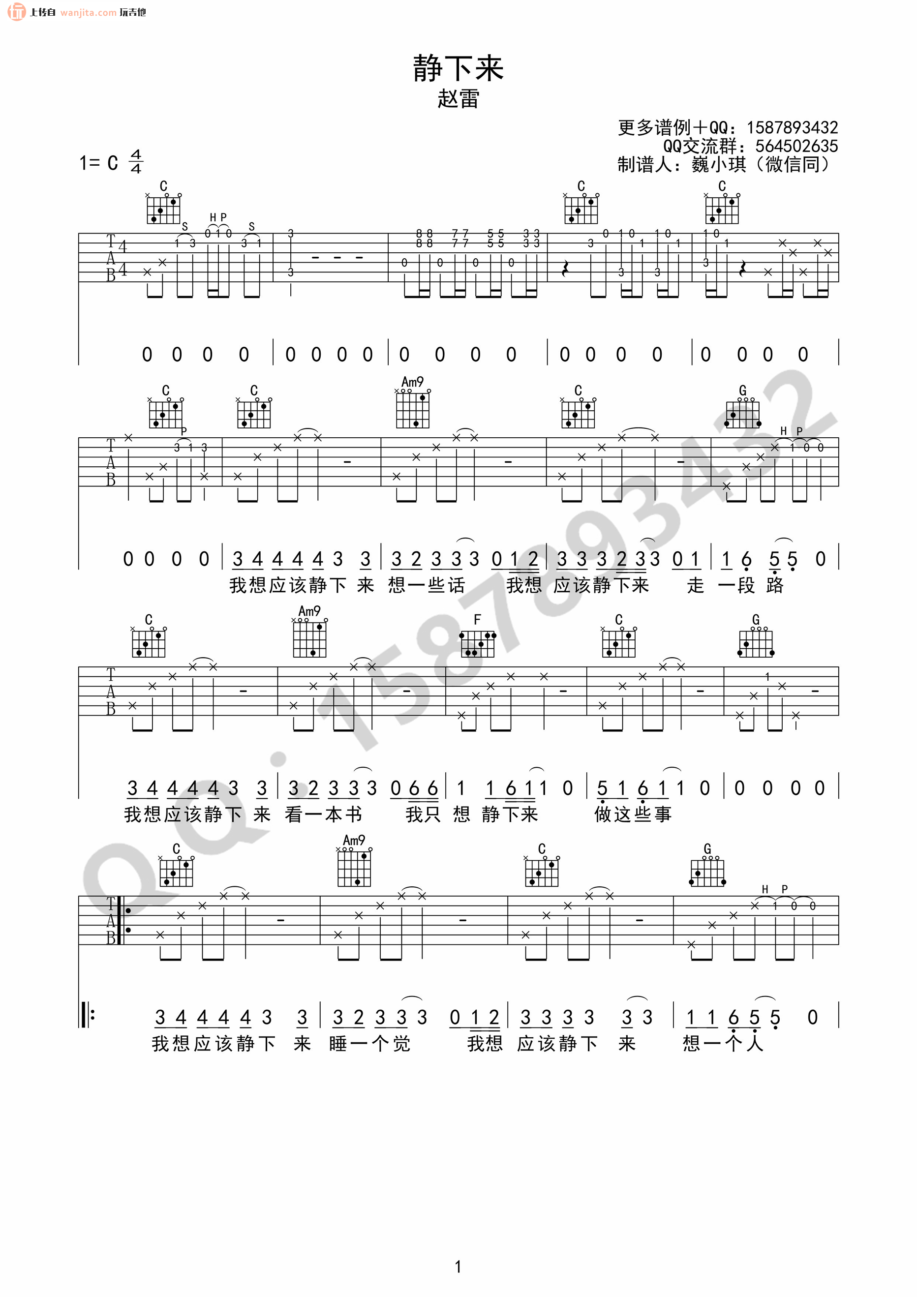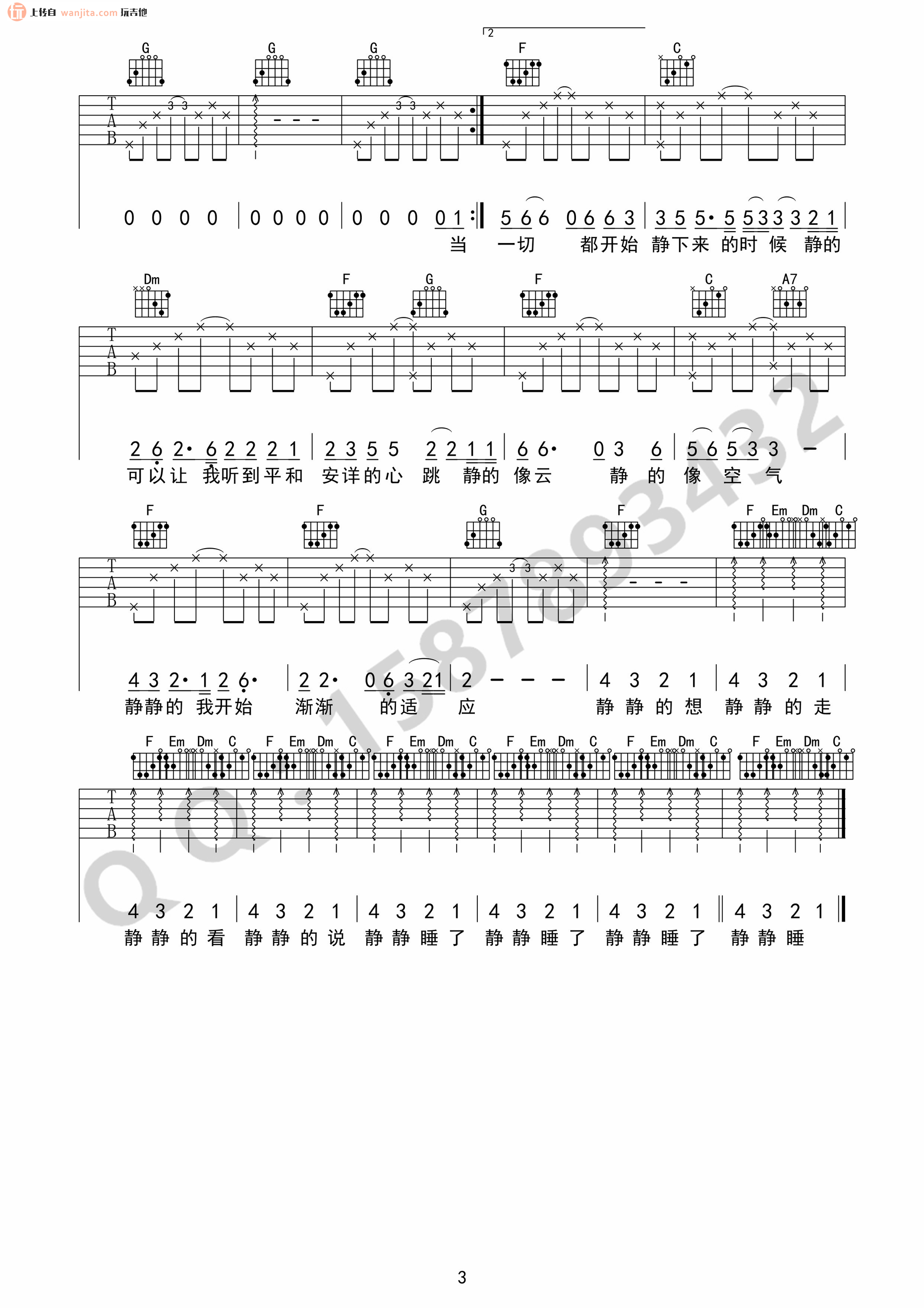 曲谱介绍: 静下来吉他谱,总共3张高清图片谱,原调为C调,节拍4/4拍,不使用变调夹,弹唱难度初级。
