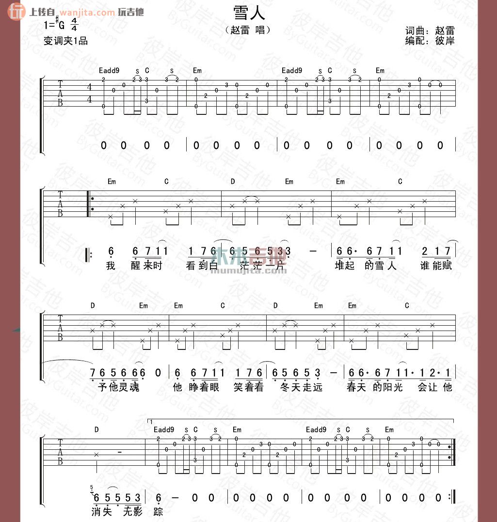 曲谱介绍: 赵雷《雪人》吉他谱,总共2张高清图片谱,原调为升G调,节拍4/4拍,弹唱建议用变调夹夹1品,弹唱难度初级。
