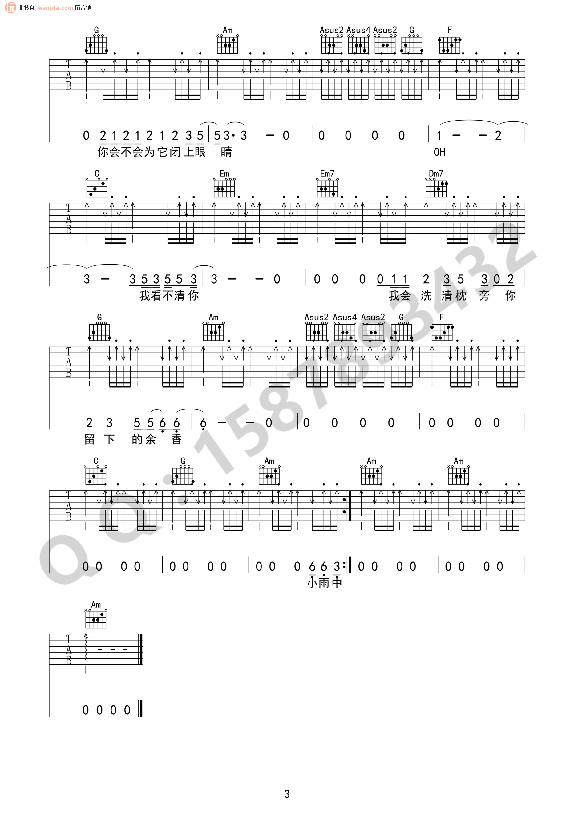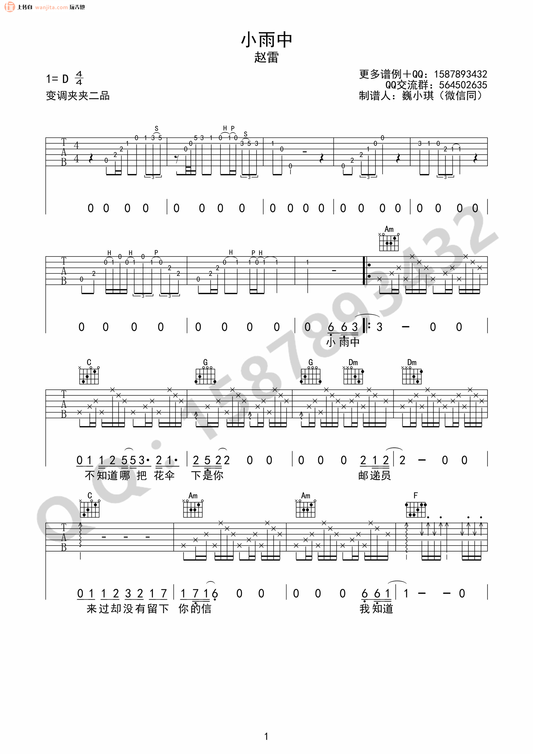 曲谱介绍: 小雨中吉他谱,总共3张高清图片谱,选用D调指法,节拍4/4拍,弹唱建议用变调夹夹2品,弹唱难度初级。