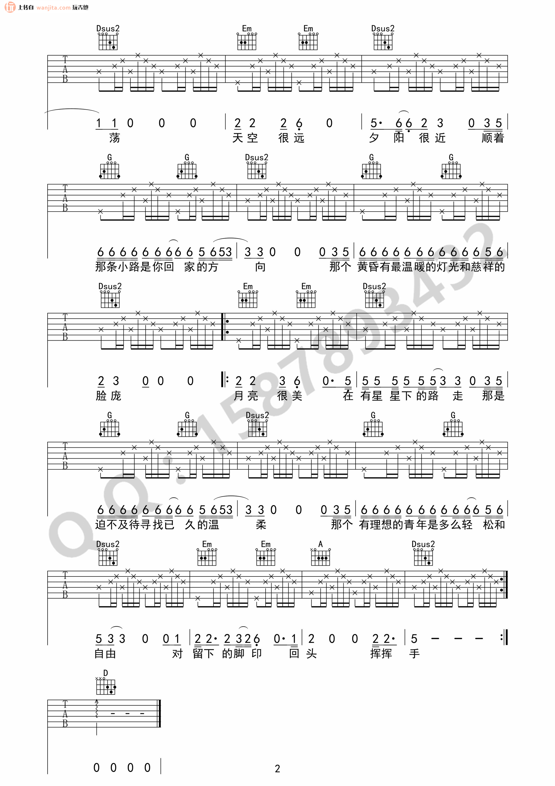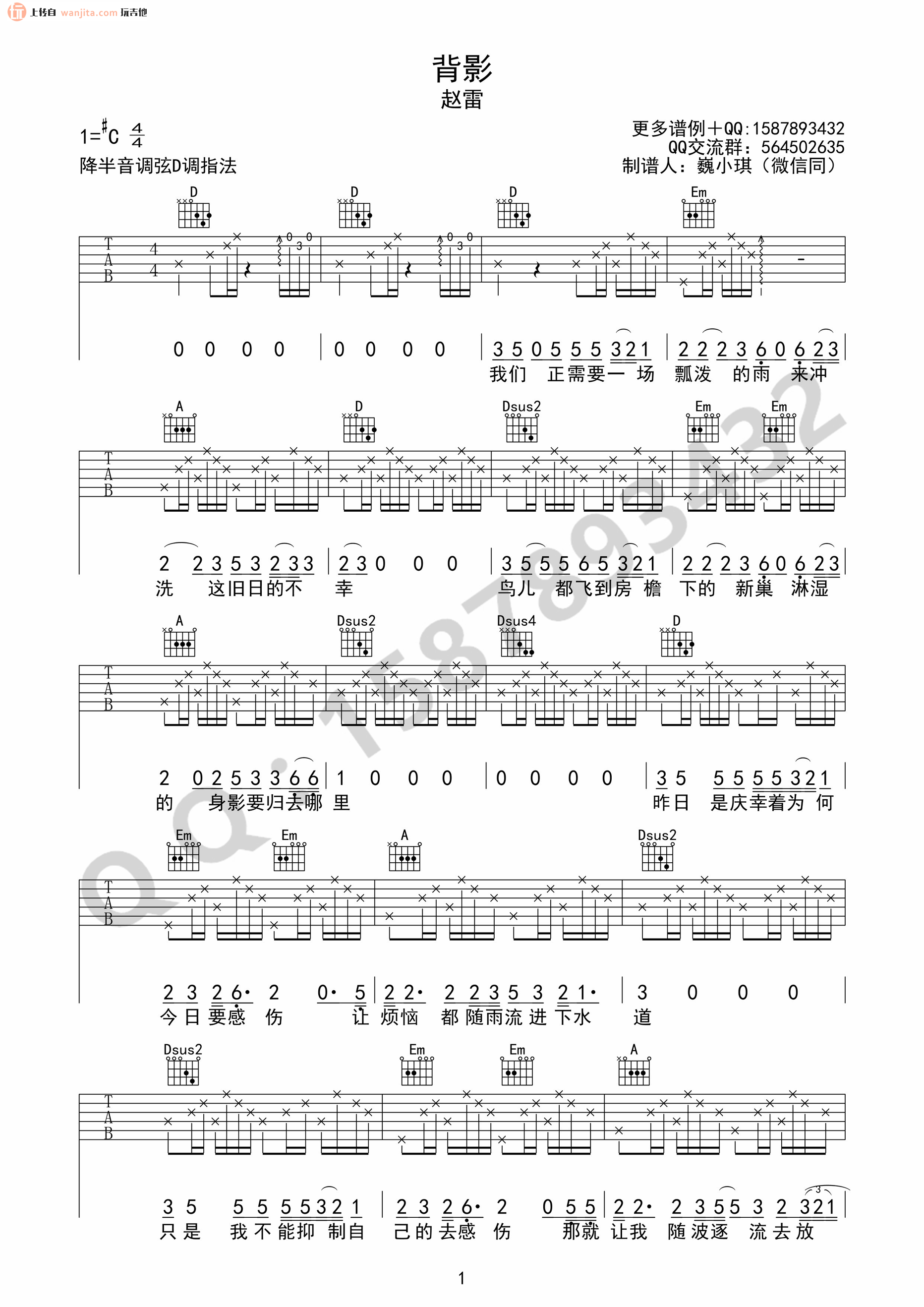 曲谱介绍: 赵雷《背影》吉他谱,总共2张高清图片谱,原调为升C调,选用D调指法,降半音调弦,节拍4/4拍,不使用变调夹,弹唱难度初级。