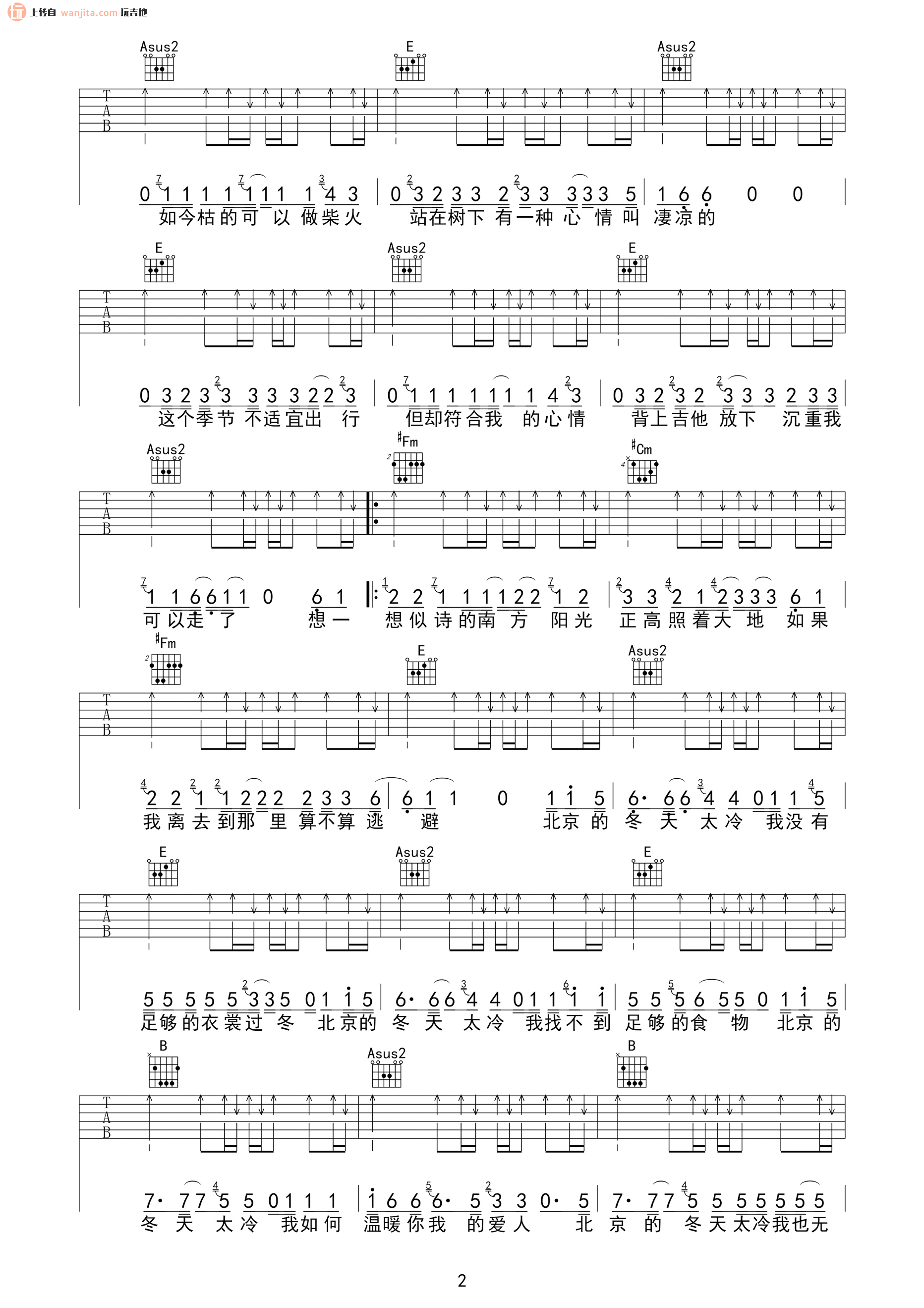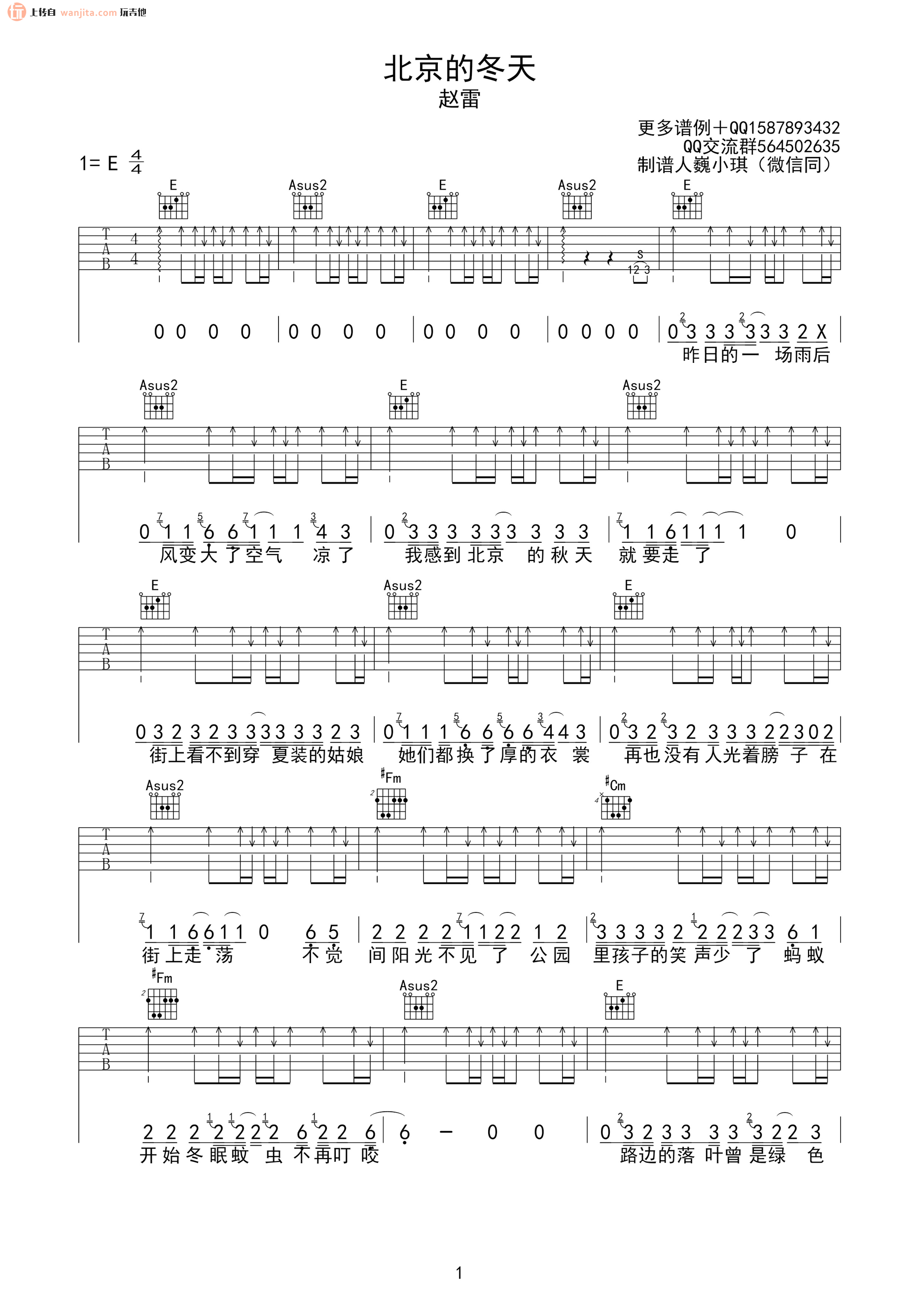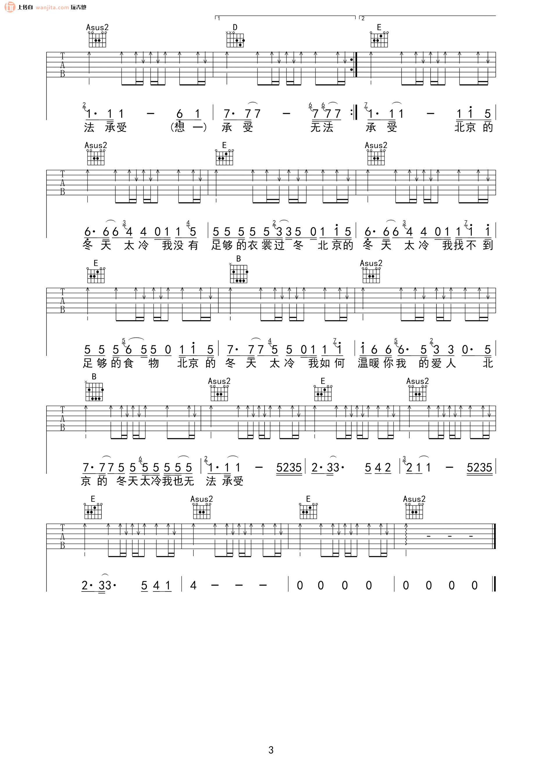 曲谱介绍: 赵雷北京的冬天吉他谱,总共3张高清图片谱,原调为E调,节拍4/4拍,不使用变调夹,弹唱难度初级。